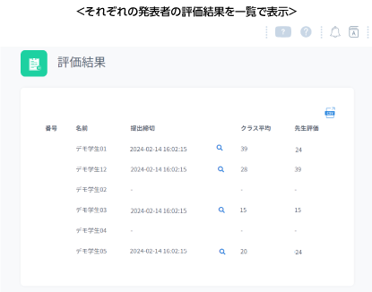『CaLabo® MX』では、1回のシート配布で複数名を評価できます。評価結果の画面には、各発表者のクラス平均評価点や先生評価点が一覧で表示されます。そのため先生は、1つの画面をチェックするだけで、計40名の発表者がどのように評価されているのか把握できます。