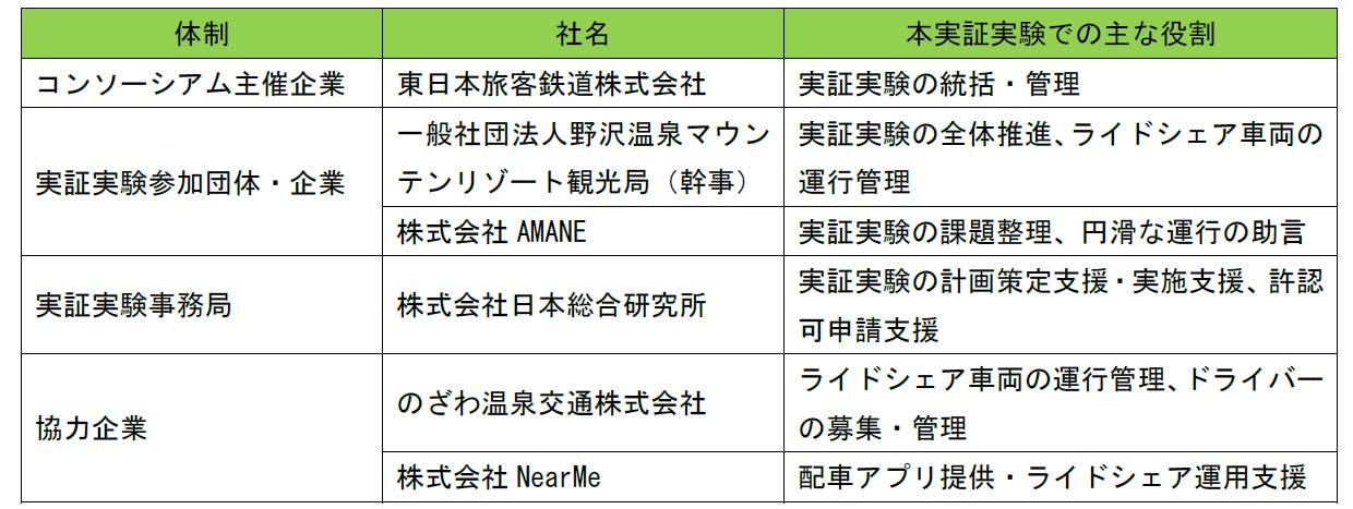 ○ 東日本旅客鉄道株式会社(本社:東京都渋谷区、代表取締役社長:喜㔟 陽一、以下「JR東日本」)、一般社団法人野沢温泉マウンテンリゾート観光局(代表理事:小田切 美幸)、株式会社AMANE(本社:東京都港区、代表取締役:井上 佳三)、株式会社日本総合研究所(本社:東京都品川区、代表取締役社長:谷崎 勝教)はJR東日本主催の「WaaS共創コンソーシアム*1」による取り組みの一環として野沢温泉村内での公共ライドシェア*2の実証実験を11月1日(金)より実施します。