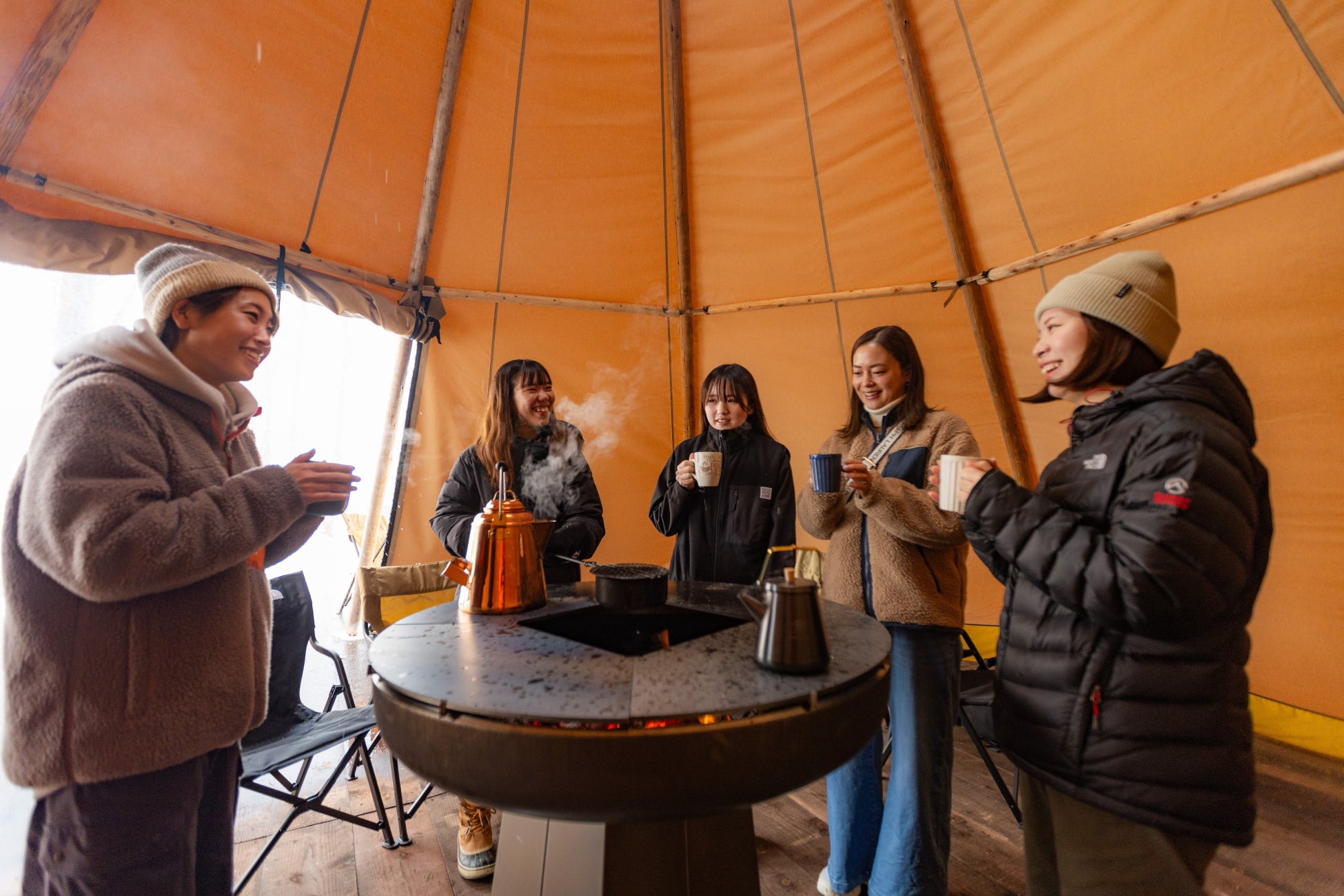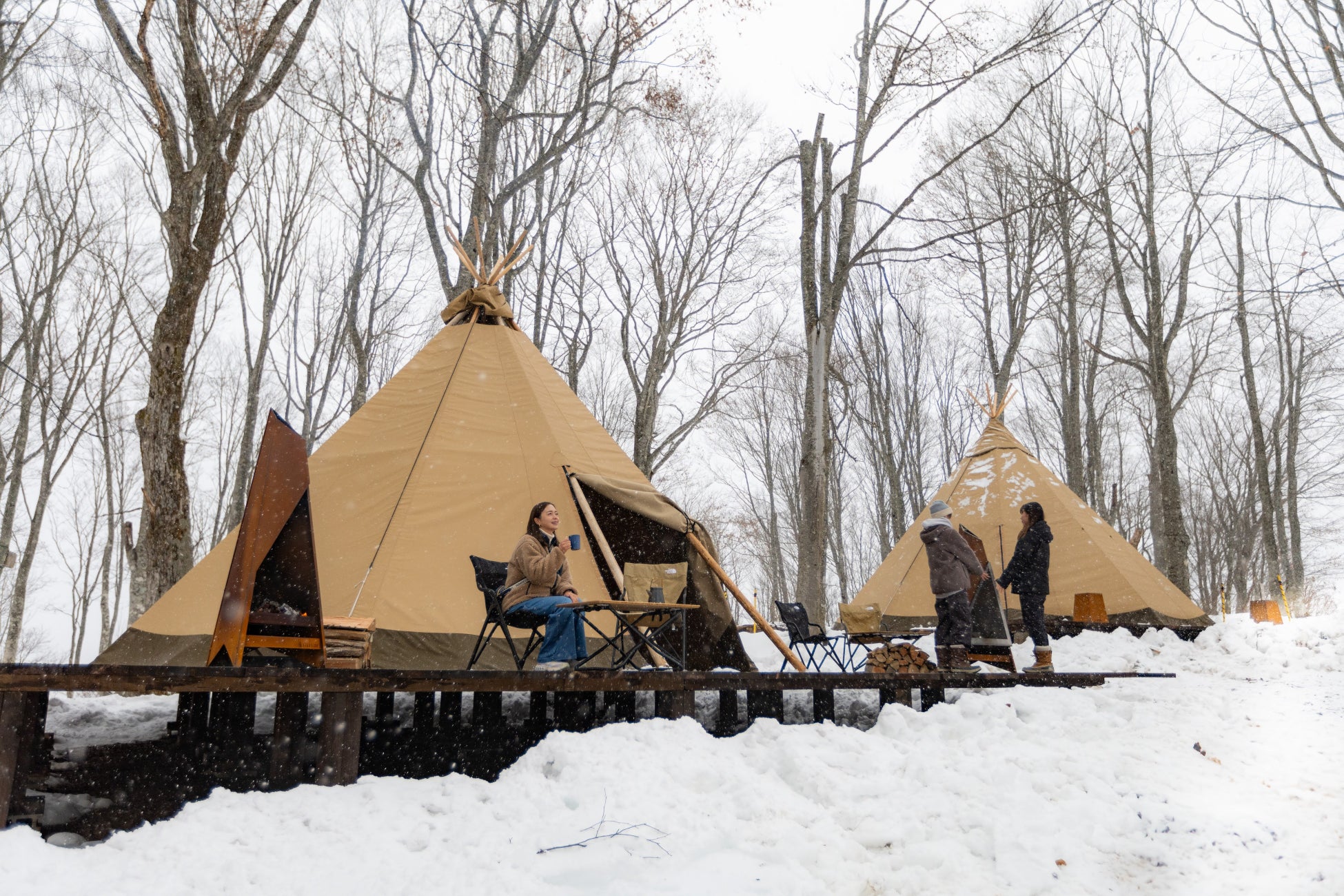 今冬好評のティピーテントが山頂ブナの森での常設設置が決定!焚火とくつろぐ「Hakuba Deli Stand」