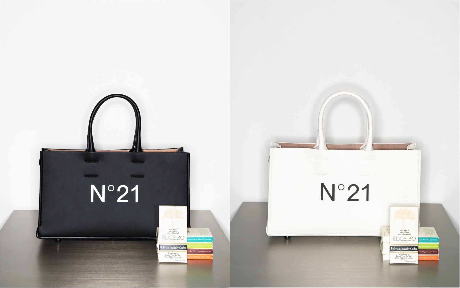 ミニサイズのハンドバッグと、ボリビア発のチョコレートブランド「エル セイボ ボリビア(EL CEIBO Bolivia)」から先住民のアマゾンモセテン族が育てる原種のバナナ“モセテンバナナ”を使ったセミドライバナナチョコレートのセット。バッグはブラックとホワイトの2色展開です。