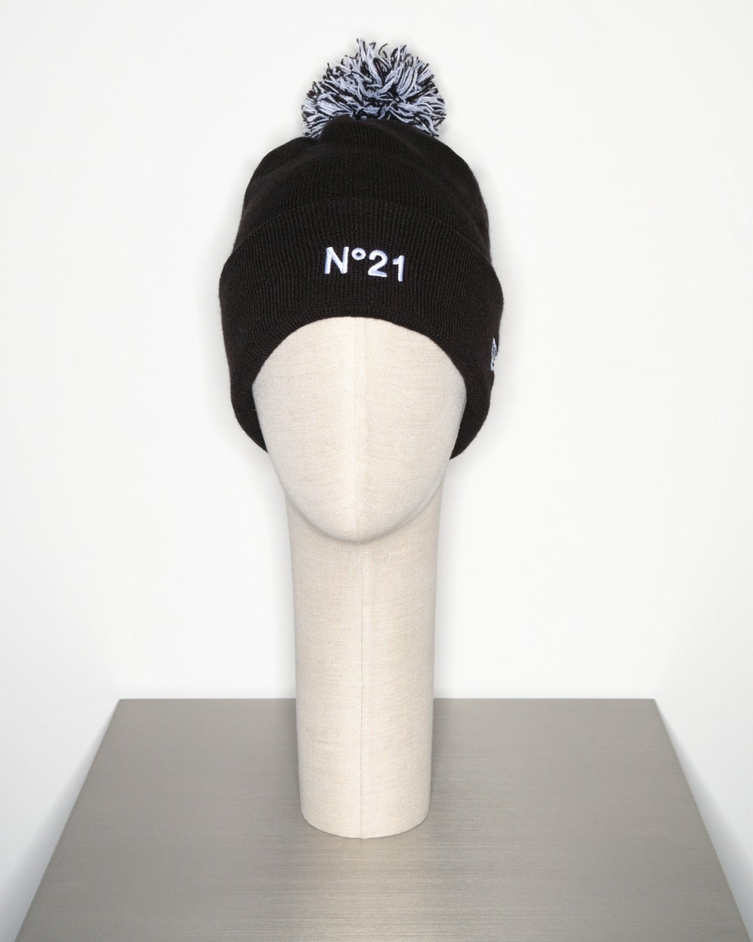 肉厚なリブ仕様に編み上げたポンポンニット。クラウン部分が頭の形状に沿うように設計された、丸みを帯びたシルエットが魅力です。ブラックにホワイトの「N21」の刺繍ロゴ。冬のギフトにもぴったりです。