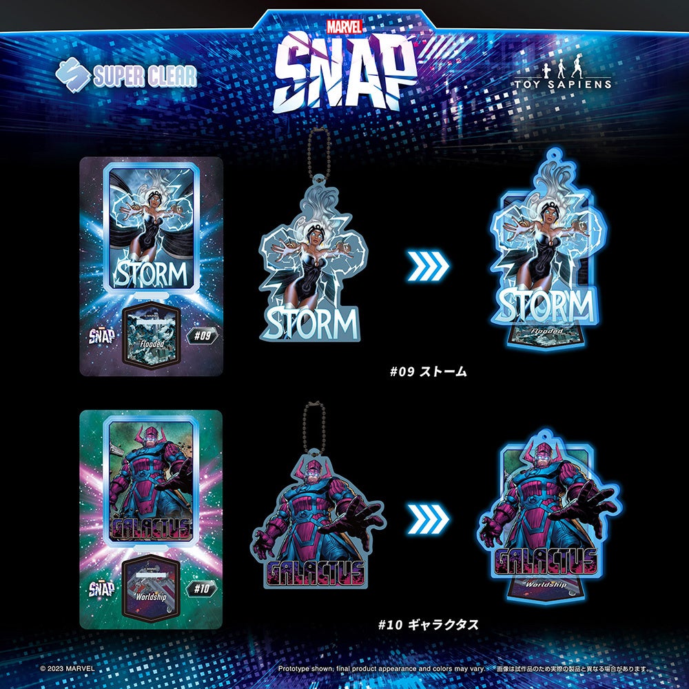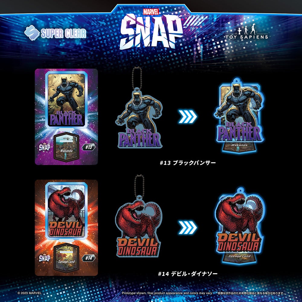 トイサピエンス」によるオリジナル企画アイテム「スーパークリア」シリーズは、アクリルカード、アクリルスタンド、アクリルキーチェーンの3通りが楽しめる新感覚のアクリルグッズです。この度、大人気カードバトルゲーム「マーベル・スナップ」のカードがデザインされた全18種がラインナップ!