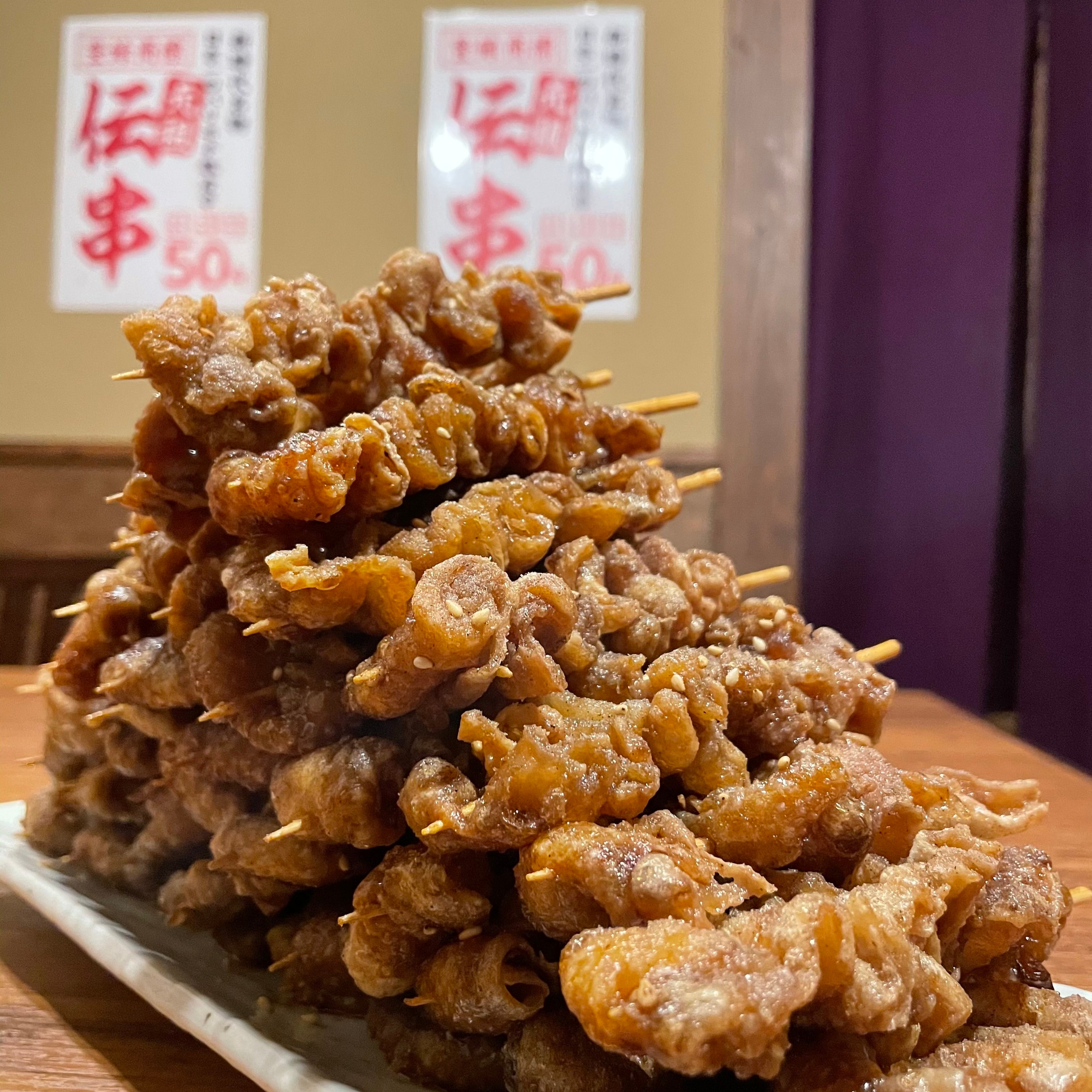 『新時代』にご来店頂いた方が必ずといっていいほど、ご注文頂くのが『伝串』です。伝串は、1本50円の揚げ鶏皮串です。一度食べると、やみつき。思わず何本も食べたくなり、平均お一人5本以上ご注文頂く、名実ともに名物商品です。
