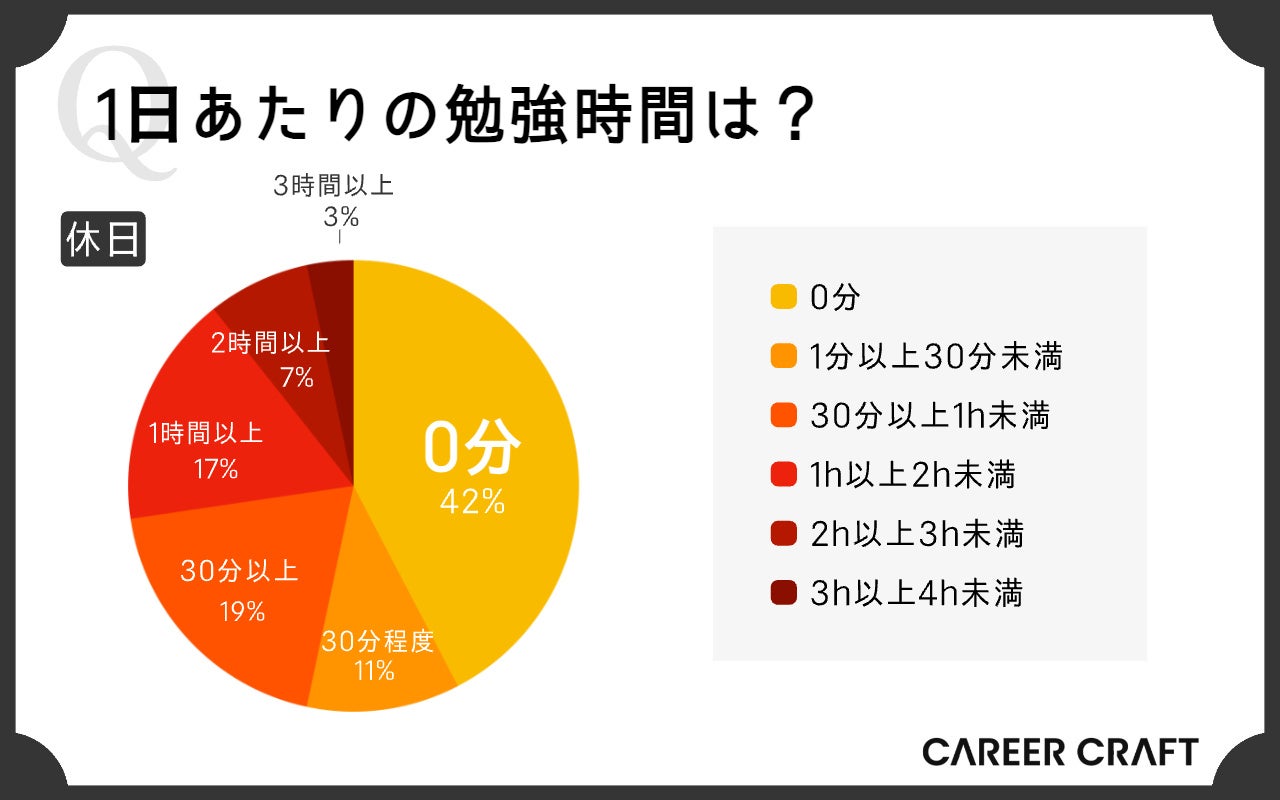 次に割合を見てみましょう。休日は平日と同様に42%の人が全く勉強していませんでした。