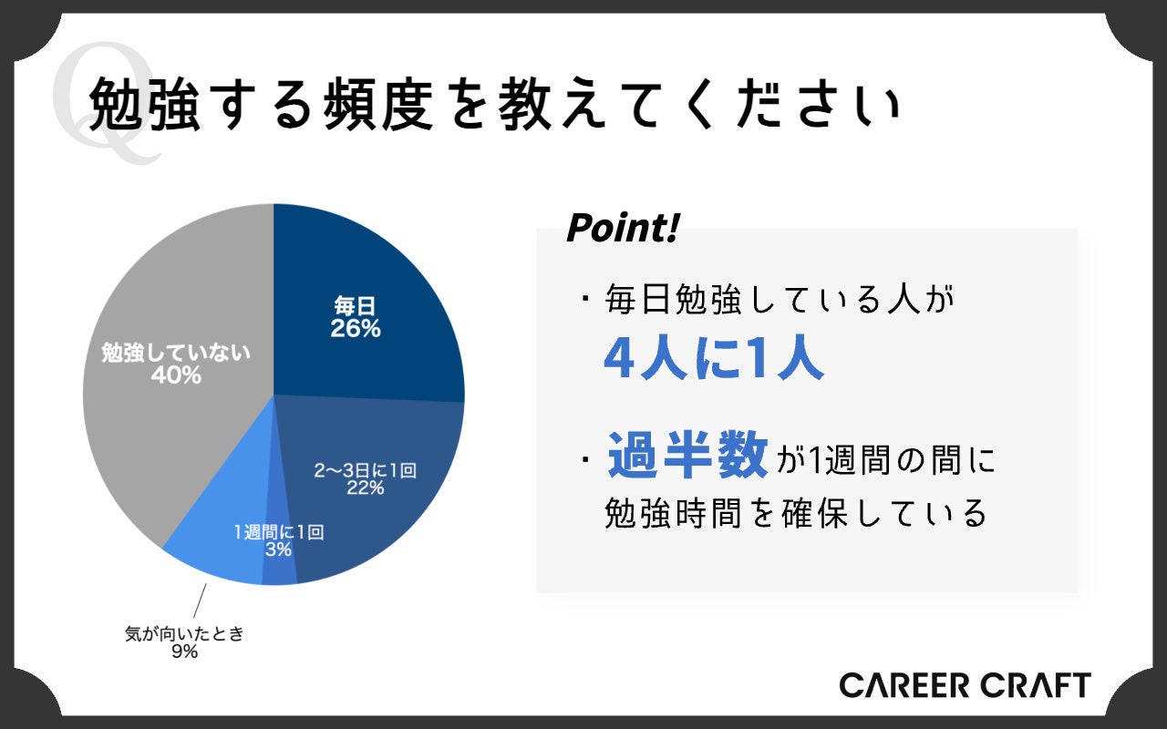 アンケートの結果、フルタイム社会人の4人に1人が、毎日勉強していることが分かりました。また、1週間のうちに勉強時間を確保している人は51%でした。
