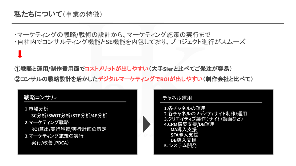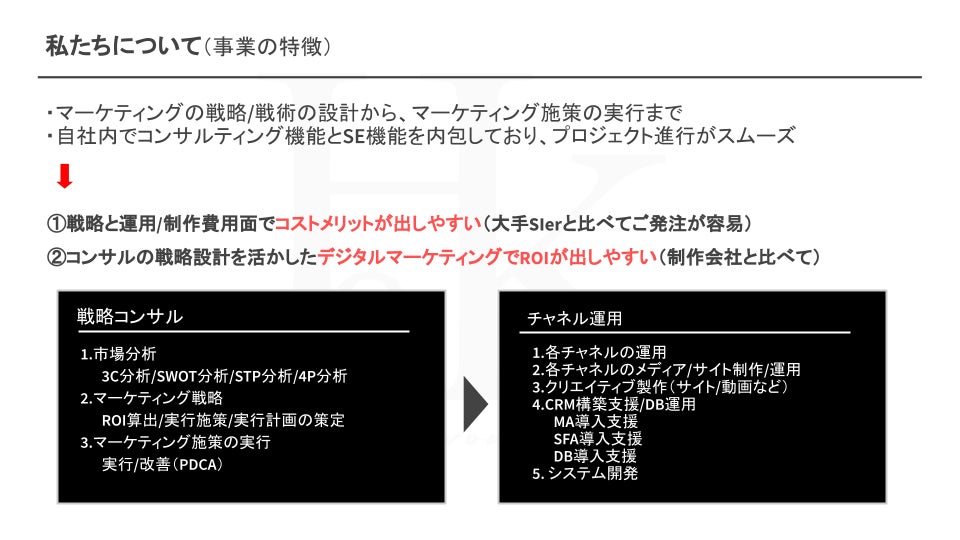 現在は営業管理や契約・人事労務周りまで包括した総合コンサル、ECサイトの構築からSEOなどの戦略設計、SNSなどを使ったブランディングや動画の作成、開発から広告運⽤、CRMやMA・SFAといったツールの設計や、API連携まで⾃社で⼀貫して⾏っております。