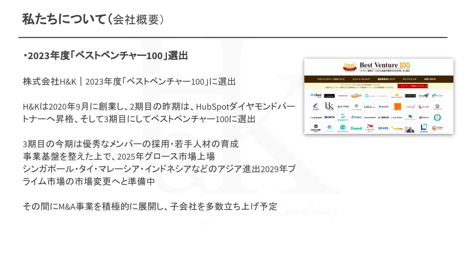 H&Kは3期目である今期、ベストベンチャー100に選出され、そのままの勢いで2025年グロース市場上場、シンガポール・タイなどのアジア進出、そして2029年プライム市場の市場変更へと準備を進めております。