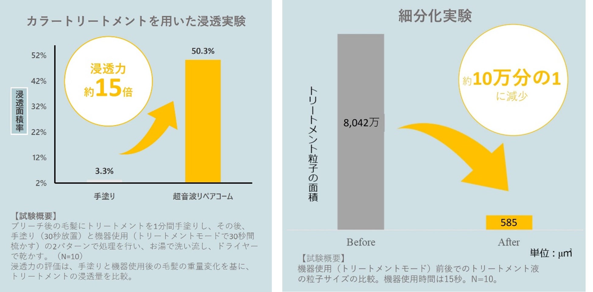 超音波の振動エネルギーにより、トリートメント成分が約10万分の1のサイズに細分化されることを確認。この微細化された成分が毛髪内部に効率的に浸透します。