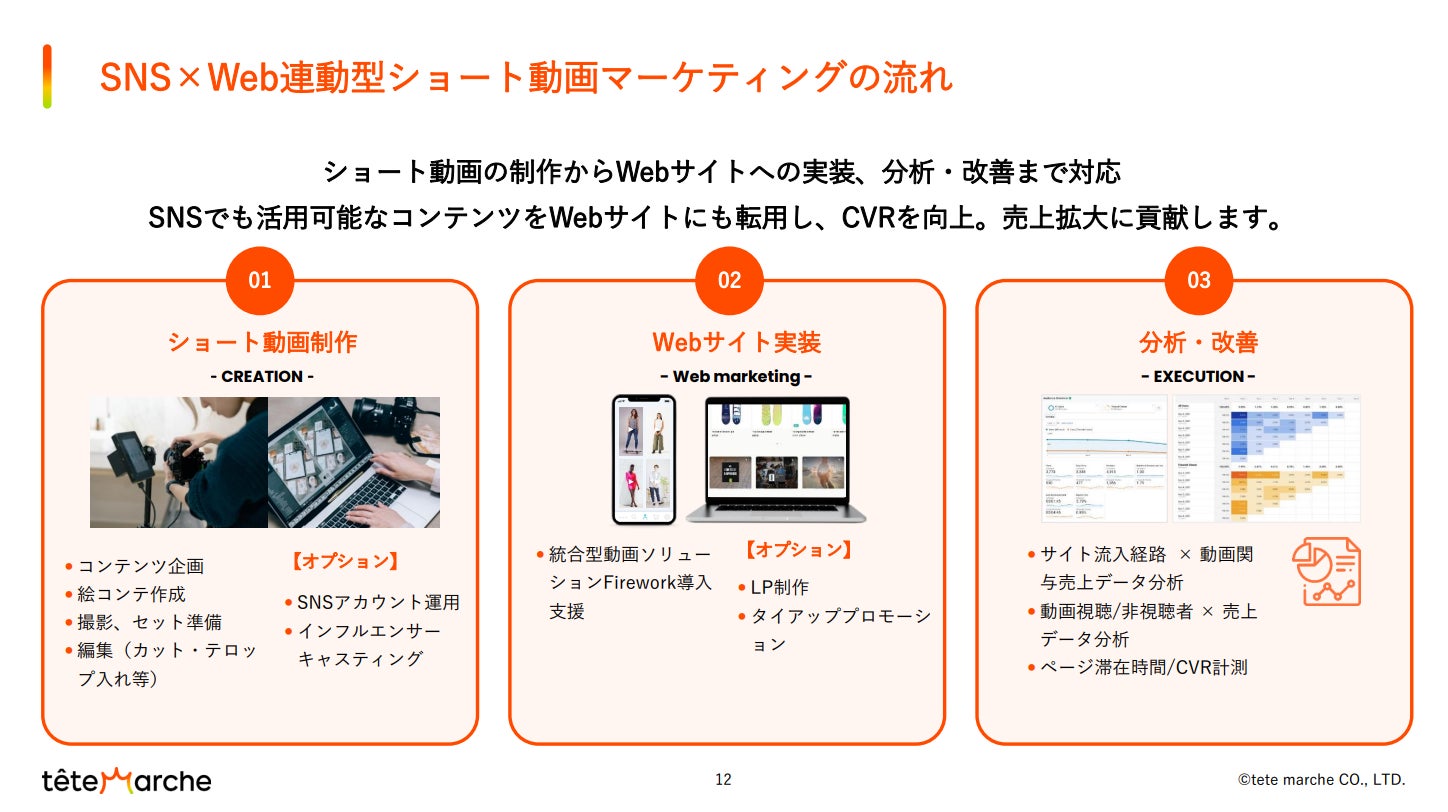 本業務提携により、SNSに最適化されたショート動画の制作だけでなく、ショート動画のWebサイトへの実装を可能にして、CVまでスムーズに繋げる新サービス「SNS×Web連動型ショート動画マーケティング支援」をテテマーチより提供いたします。企業は本サービスの導入により、SNSとWebサイトを横断したマーケティングをおこない、ショート動画制作における費用対効果を高め、WebサイトのCVR向上と売上拡大に期待することができます。さらに、お客様がWebサイトに訪れて動画を視聴したデータは企業の資産となり、マーケティング施策にご活用いただくことも可能です。