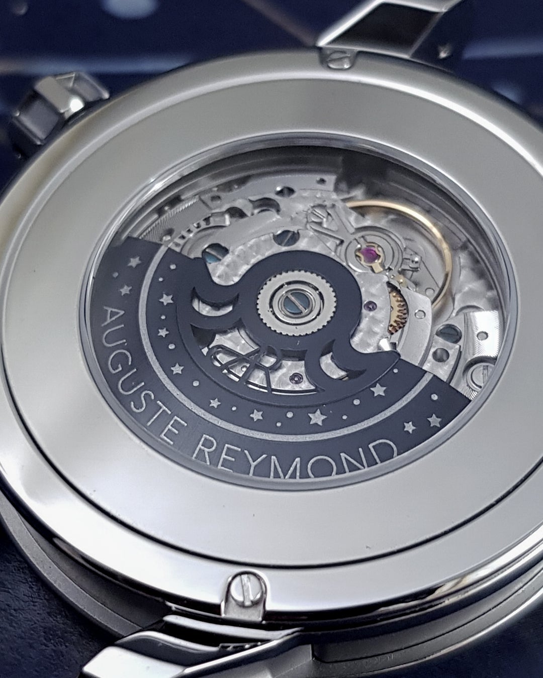 サファイアクリスタルの裏蓋から覗くのは、スイス製自動巻きキャリバー「AR 200-1」。42時間のパワーリザーブを備え、月面のモチーフとメゾンのロゴがオープンワークで施されたローターが、優雅に回転する様を直接鑑賞することができます。文字盤の6時位置には日付表示を配置。機能美と詩情を両立した、まさにオーガストレイモンドらしい一本です。