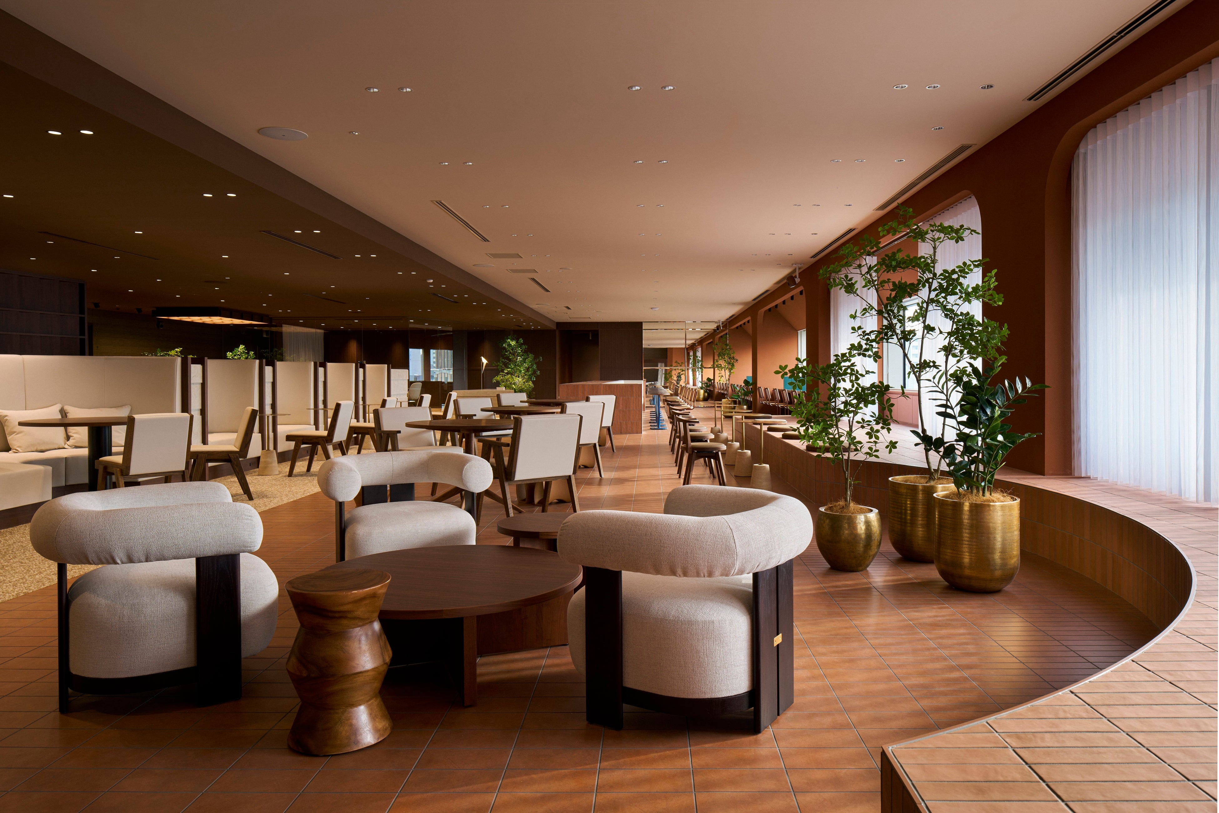 心地よい光や緑の要素を取り入れた裏庭のようなラウンジ空間。ランチや少人数での打合せなど多様なシーンでご利用いただける空間です。