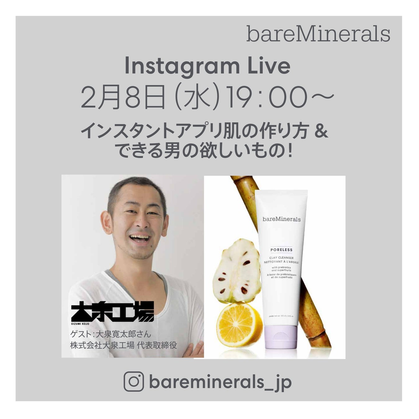 クリーンビューティーのリーディングブランド「ベアミネラル」を輸入販売するベアエッセンシャル株式会社(本社:東京都中央区、代表:菅野 沙織)は、2023年2月8日(水)、 「地球を笑顔で満たす」を企業理念とする株式会社大泉工場 大泉 寛太郎社長をゲストにお迎えし、できる男の欲しいものをゲストにお話しいただきます。