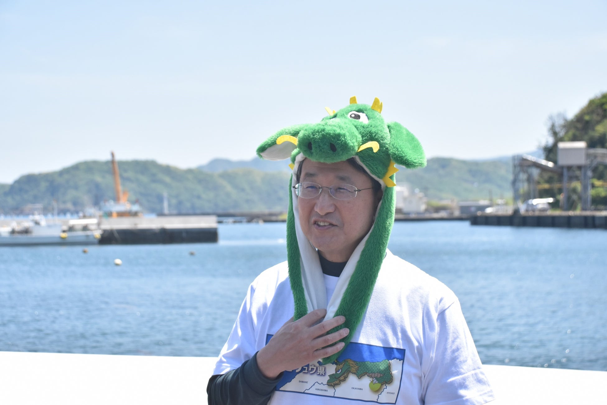 「龍神洞遊覧クルーズ」の出発地である田後(たじり)漁港では、鳥取県 平井知事らが出席し出発式が行われました。遊覧船コースを運航する山陰松島遊覧株式会社への激励や、地元岩美町の盛り上がりを祈念して、平井知事は「龍神洞を海から間近に見ることができるコースは、これからの季節にピッタリ!龍が棲んでいるといわれている龍神洞に沢山の人にきていただきたいです。鳥取県にウェリュウカム!」とコメントし、観光客の皆様をツアーへ連れ出す小型船「うらどめ号」の前で記念撮影も行いました。