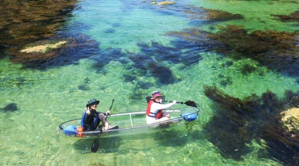 最高透明度25mの城原海岸を中心に、スケルトンボディーのクリアカヤックでツーリングすることができます。カヤック自体が透明になっていることで、透き通る美しい海に浮いているような神秘的な体験ができます。実施前にベテランガイドから丁寧なレクチャーがあるため、初心者の方でもご家族でも安心して楽しむことができます。