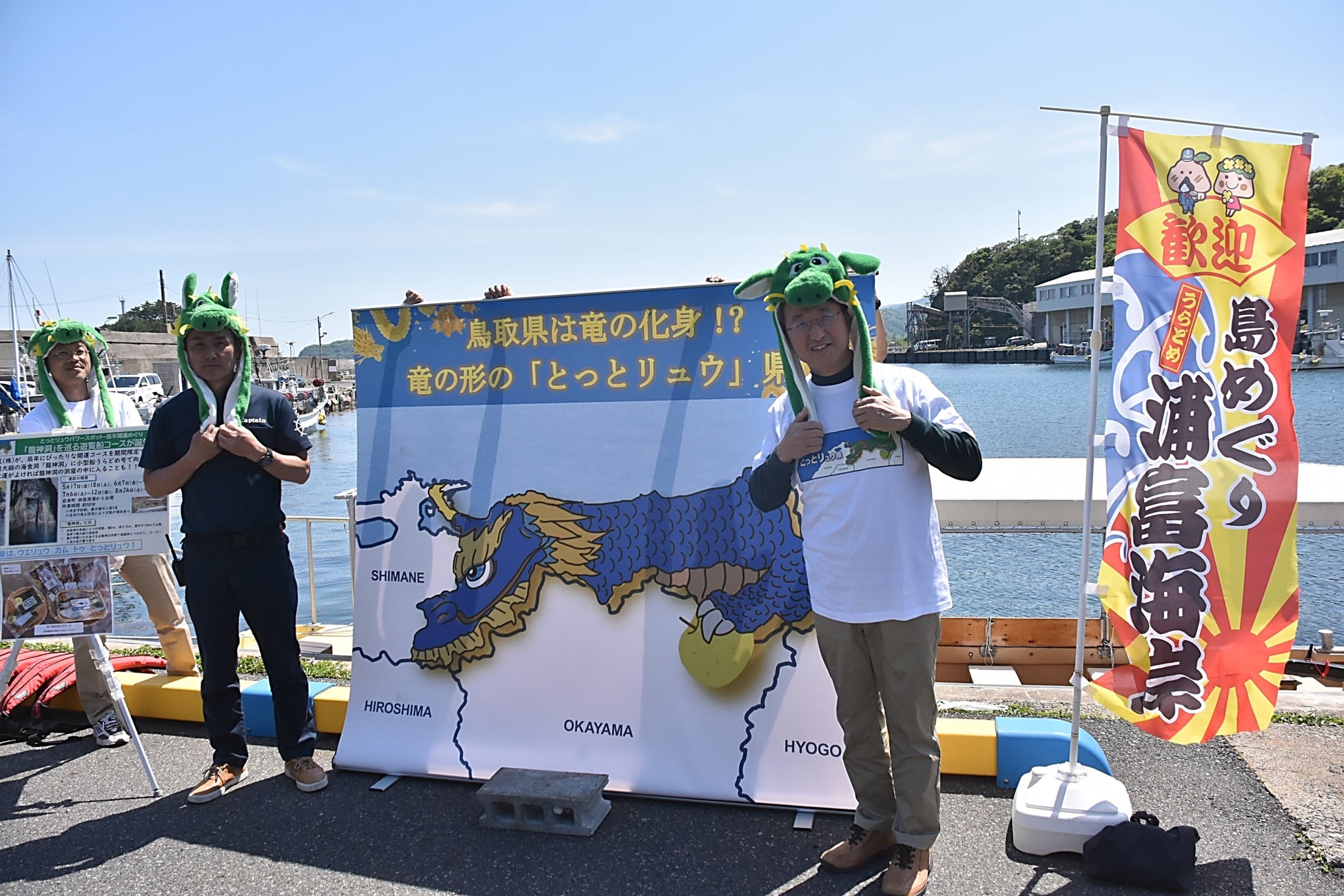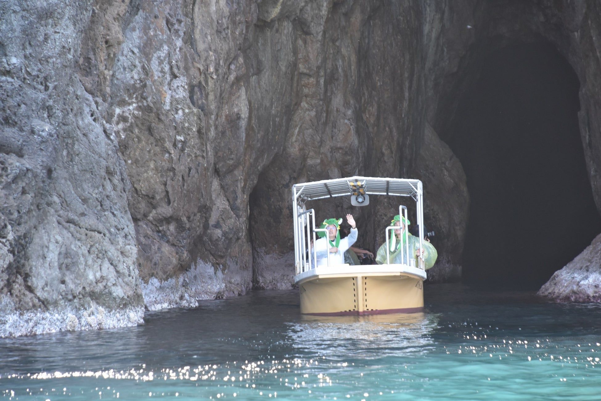 山陰松島遊覧株式会社では辰年限定の開運ツアーとして、高い透明度と美しい自然が織りなす絶景で知られる浦富(うらどめ)海岸の龍神洞(りゅうじんどう)を巡るクルーズを、5月17日(金)より運航開始します。5月11日(土)に現地で行われた乗船体験イベントには、鳥取県知事 平井伸治氏も駆け付け、自らクルーズの魅力をアピールしました。また、龍神洞付近では地元アクティビティ関係者による、岩美町の海岸で体験可能なアクティビティの披露も行われました。