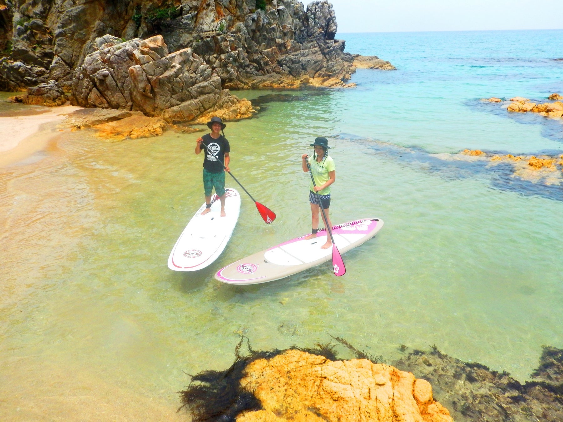 中学生以上のお子さまからご年配の方まで、どなたでも楽しめるがSUPの特徴。ボードの上で立ったり座ったり、時には寝そべって本を読んだり、全身のエクササイズ効果も。基本的な動作ができるようになれば、自分だけの遊び方をアレンジすることができる、自由度たっぷりなマリンアクティビティです。浦富海岸は透明度バツグン!まるで海の上を歩いているような、爽快な気分です。