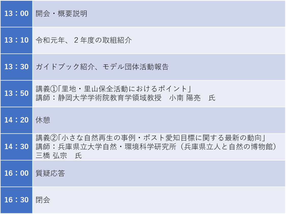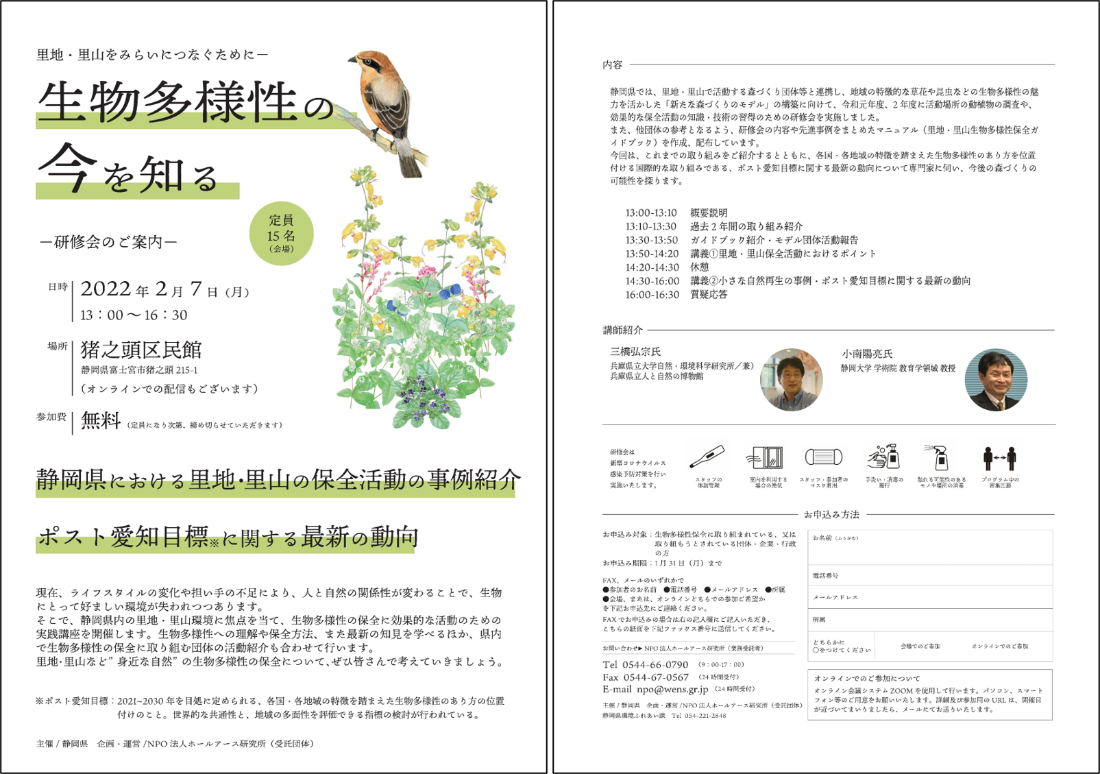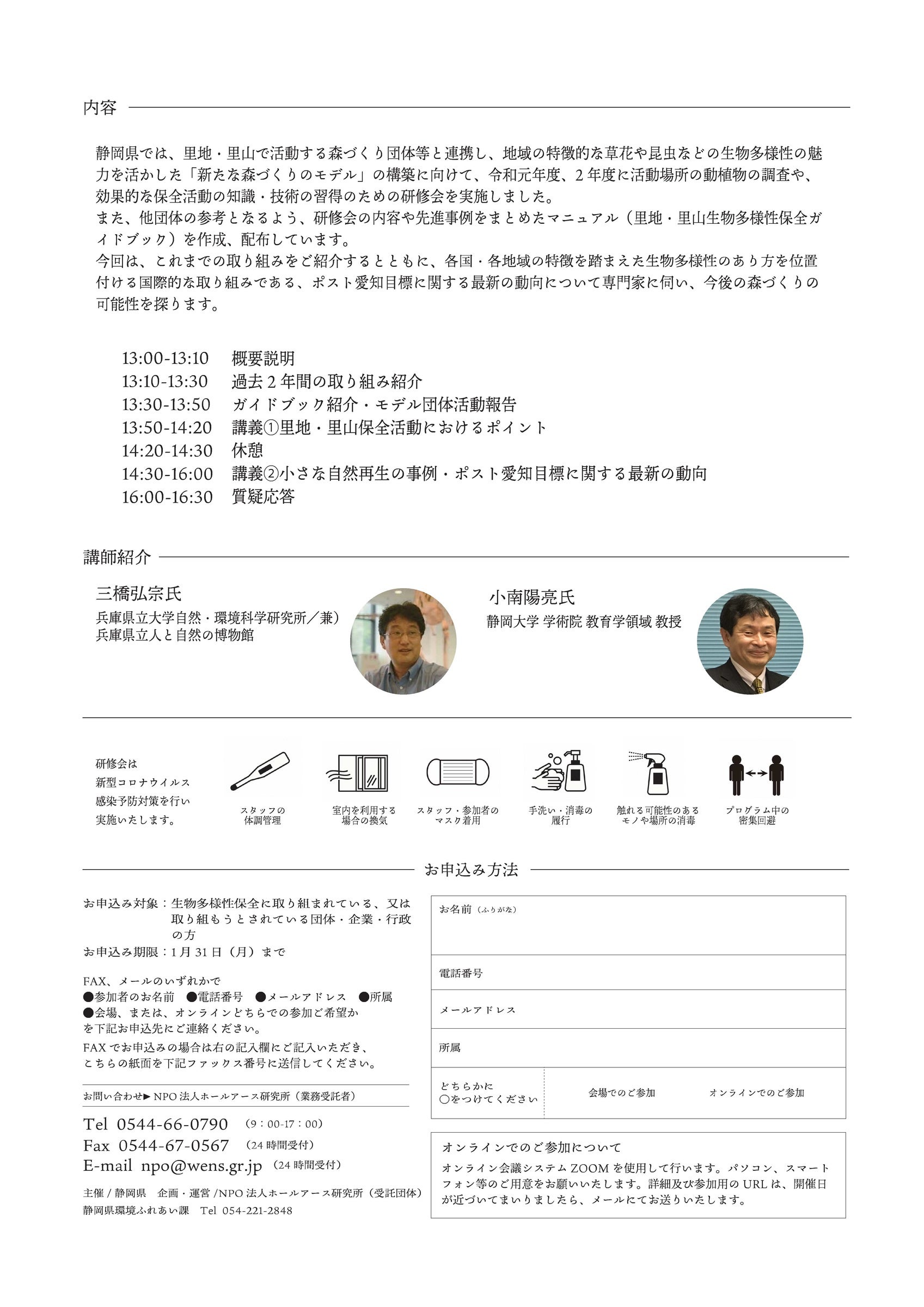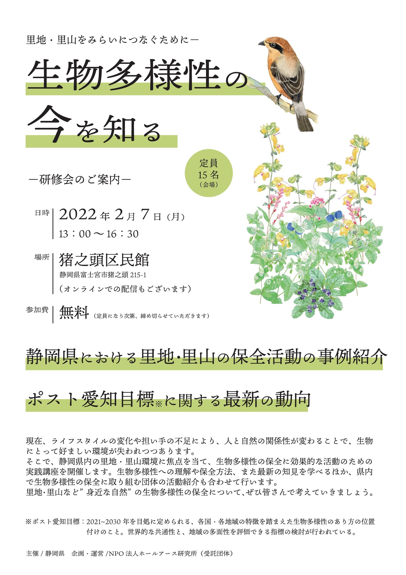 静岡県は、静岡県における里地・里山の保全活動の事例紹介やポスト愛知目標などの生物多様性に関する最新の動向を学ぶ研修会を令和4年2月7日(月)に開催します。