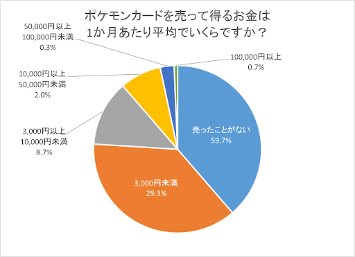 「ポケモンカードを売って得るお金は1か月あたり平均でいくらですか?」という質問では、「売ったことがない」を除き、「3,000円未満」が112票、「3,000円以上10,000円未満」が38票を集めました。