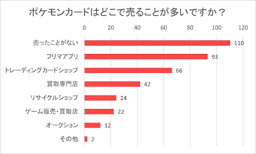 「ポケモンカードはどこで売ることが多いですか?」という質問では、「売ったことがない」が110票と最多でしたが、次に「フリマアプリ」が93票、「トレーディングカードショップ」が66票を集めました。
