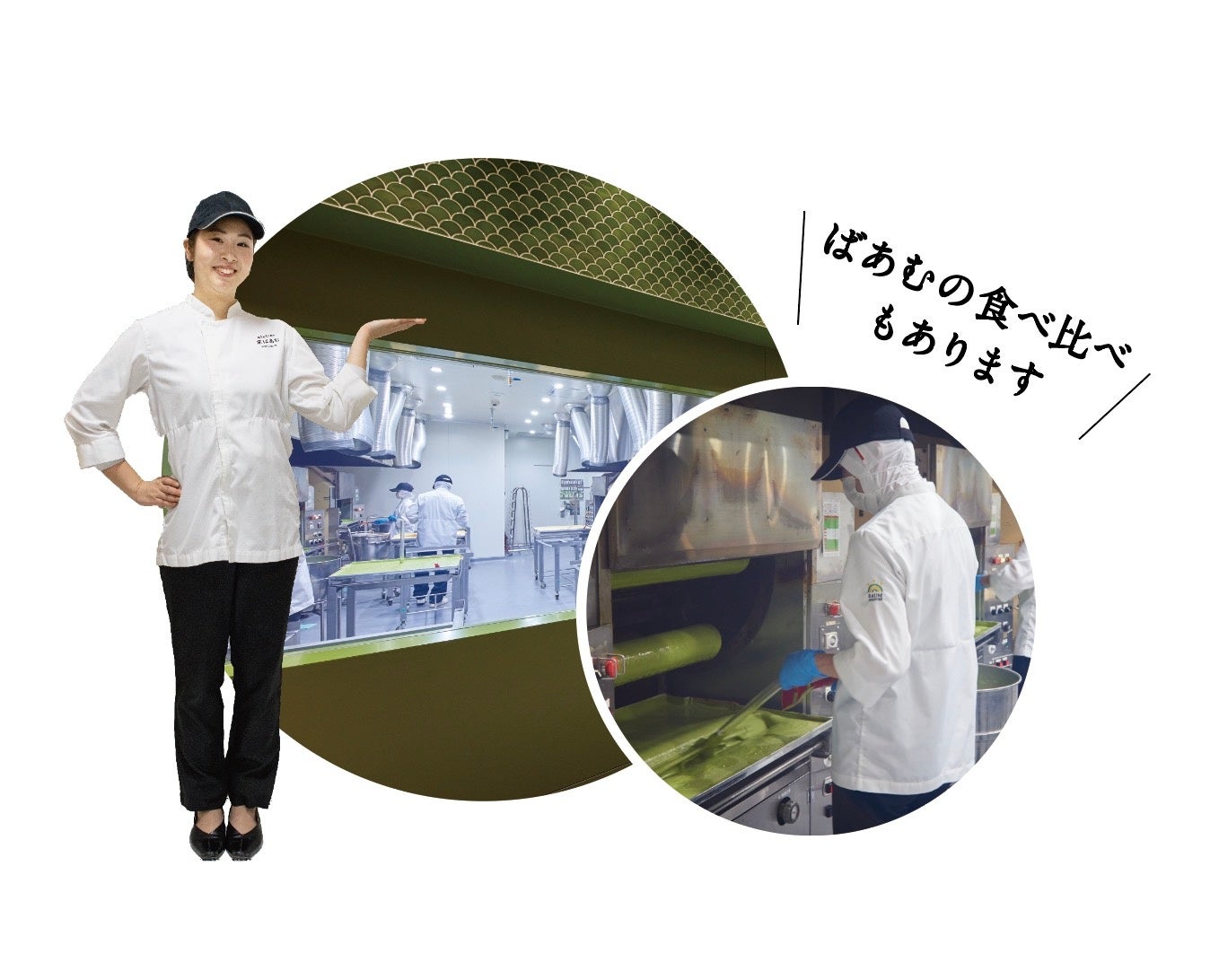 atelier京ばあむで販売しているバームクーヘンの食べ比べ(一部)とともに、見学通路から工場を案内するツアーです。試食時には、京ばあむに使用している抹茶のこだわりもご紹介します。
