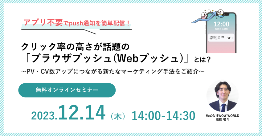 無料オンラインセミナー「アプリ不要でプッシュ通知を簡単配信!クリック率の高さが話題の『ブラウザプッシュ(Webプッシュ)』とは?」12月14日(木)開催のお知らせ