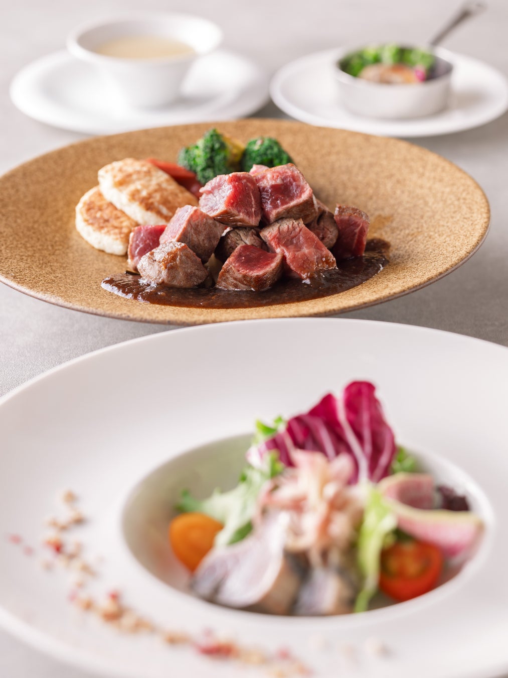 夜のディナータイムには「造り」が添えられ、より華やかなコースに。旬の味覚と滋賀の恵みを思う存分楽しめる、この秋だけの特別なご馳走です。
