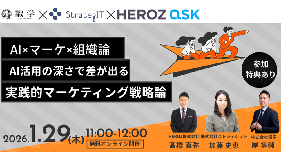 HEROZ株式会社(本社:東京都港区、代表取締役CEO:林 隆弘、以下「HEROZ」)は、株式会社ストラテジット(本社:東京都港区、代表取締役社長:加藤 史恵、以下「ストラテジット」)および株式会社識学(本社:東京都品川区、代表取締役社長:安藤 広大、以下「識学」)と共催で、生成AIの業務活用と組織マネジメントの関係性をテーマとした無料ウェビナー「AI×マーケ×組織論。AI活用の深さで差が出る実践的マーケティング戦略論」を、2026年1月29日(木)に開催いたします。