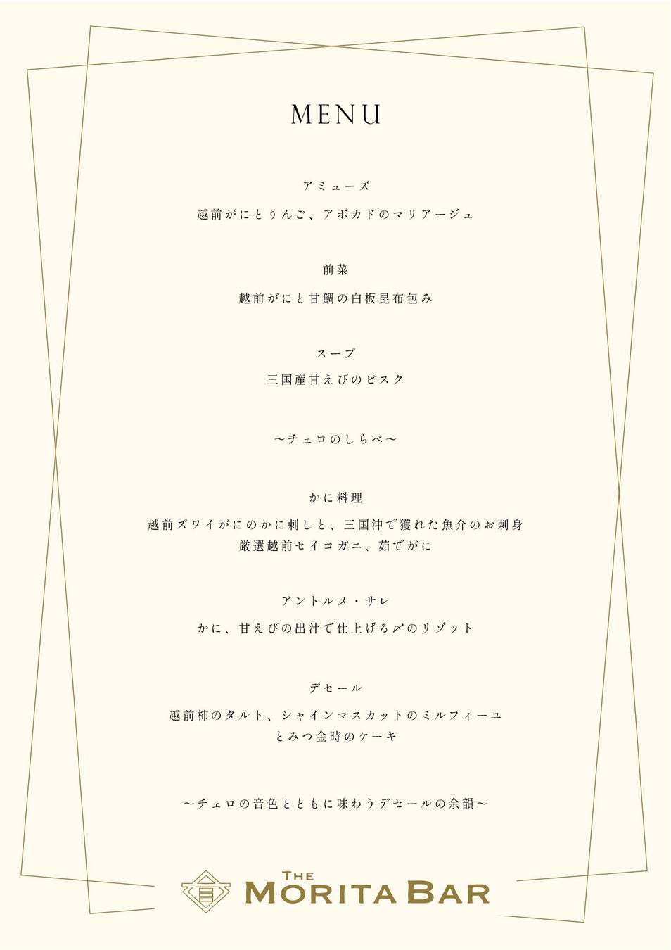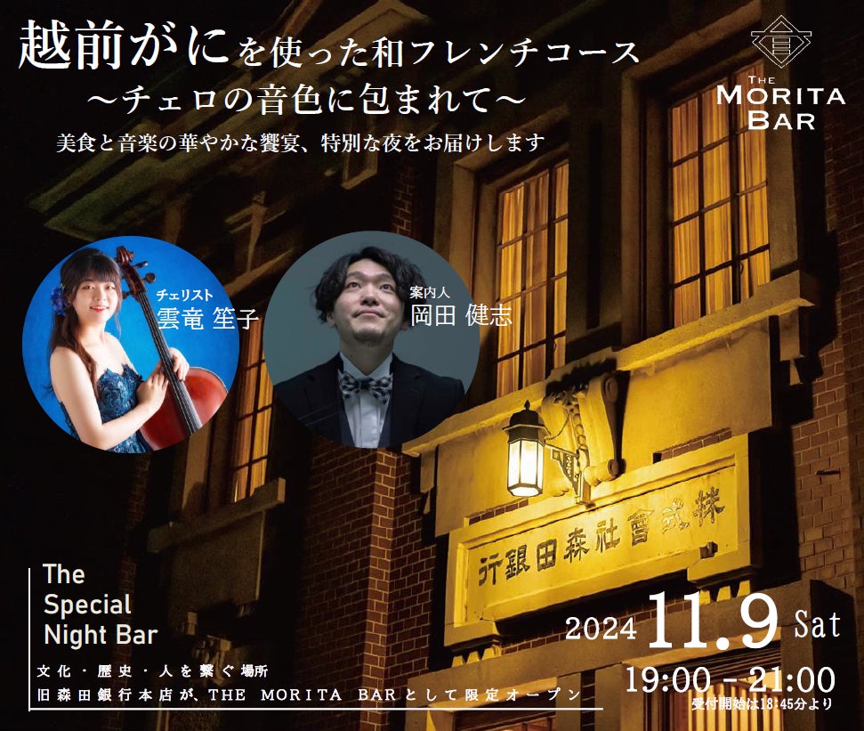 THE MORITA BAR 2024「越前がにを使った和フレンチコース〜チェロの音色に包まれて」○2024年11月9日(土)19:00〜21:00開催