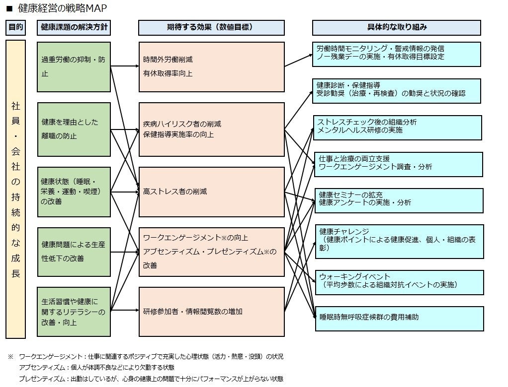 健康診断の受診状況、健康に関するアンケート等より、社員の健康課題を把握し、優先的に取り組む課題を決め、実施計画(健康経営の戦略MAP)を策定します。