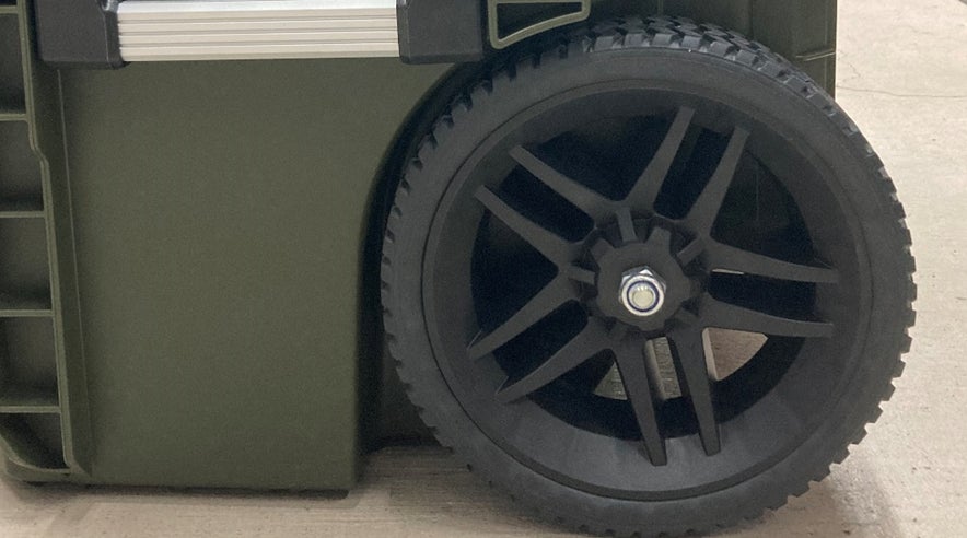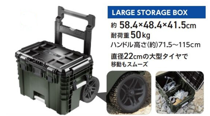 システムキャリーのタイヤには、直径22cmの大型タイヤを使用しています。樹脂+ゴム材の大形タイヤが搭載されており、荒れた路面や段差でもスムーズに走行が出来ます。建設現場や自動車整備の現場といった、移動が頻繁な現場での使用にも便利です。