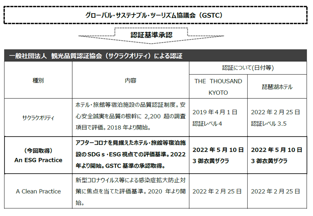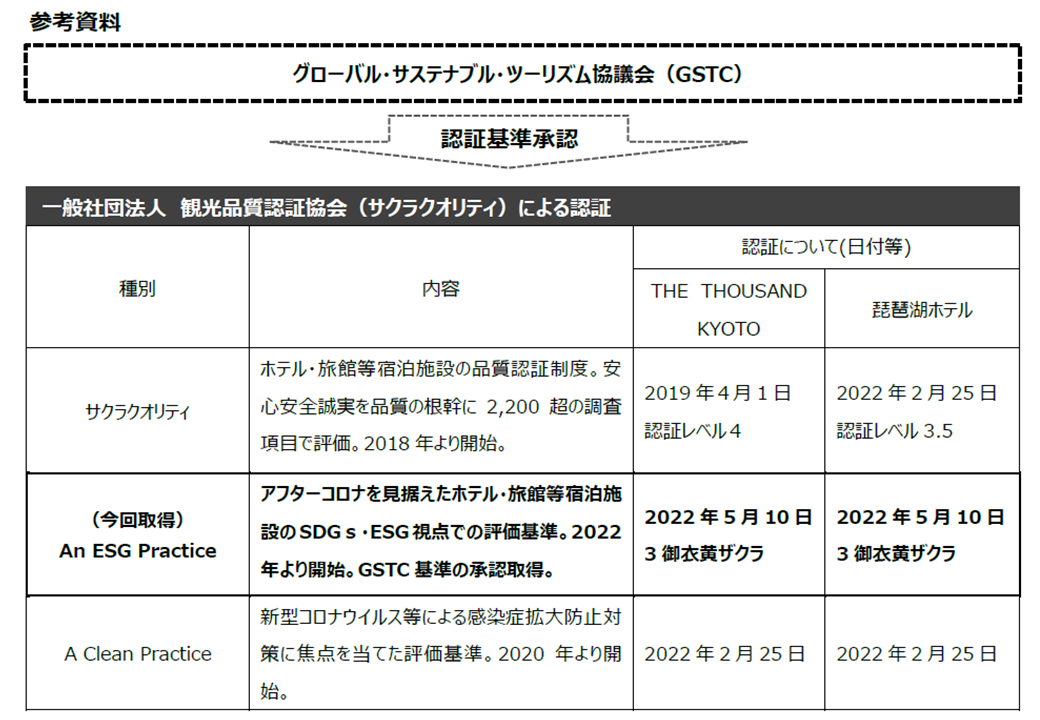 今回認証取得したサクラクオリティの「An ESG Practice認証」について、当社2ホテルは今年2月25日に認証を受けておりましが、今般、この「An ESG Practice認証」がサステナブルツーリズムに関するグローバルな基準を策定するGSTC(Global Sustainable Tourism Council)から基準の承認を受け、国際的な基準に則した認証であることが確認されました。さらに、GSTCからの基準認証にあたって基準項目の達成度により5段階のレベルに分けられ、当社2ホテルはそのうち3段階目にあたる「3御衣黄(ぎょいこう)ザクラ (excellent)」を取得しています。