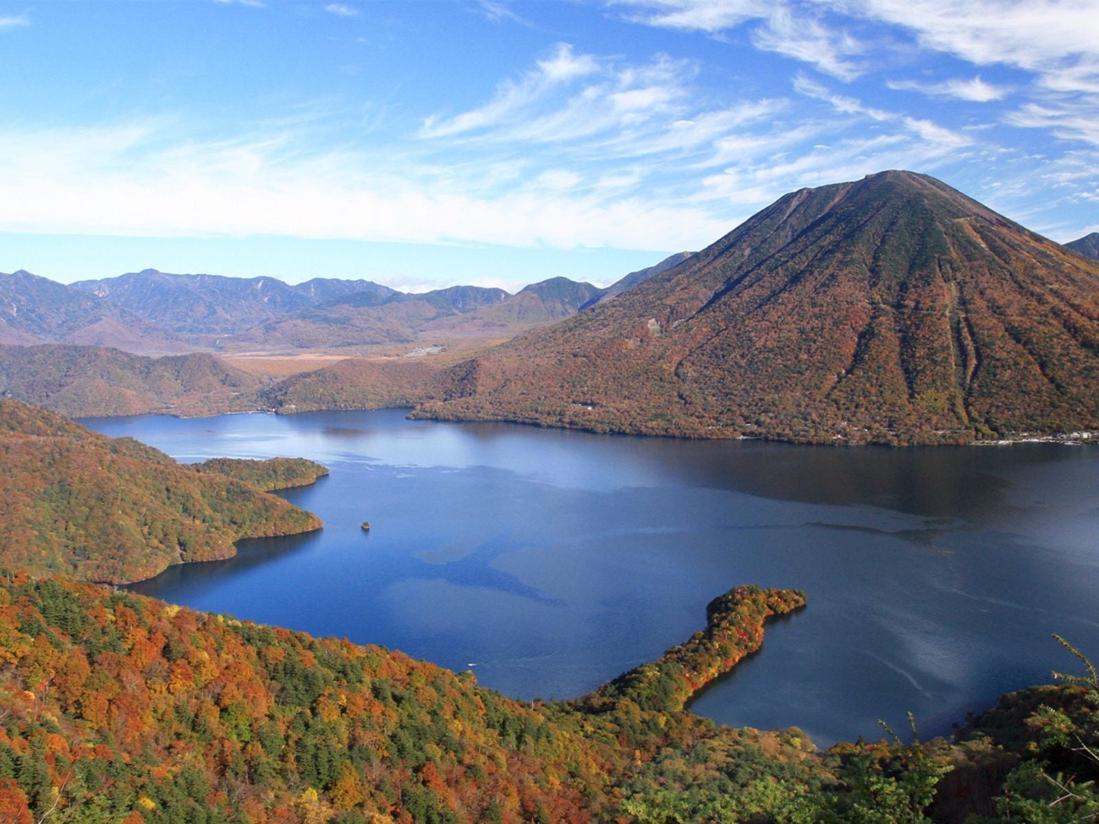 中禅寺湖は、標高約1,269mに位置し、湖面に映る紅葉と周囲の山々の彩りが有名な秋の絶景スポットです。例年10月中旬から11月上旬が見頃で、遊覧船からの移ろう景色や、湖畔散策の風情も堪能できます。