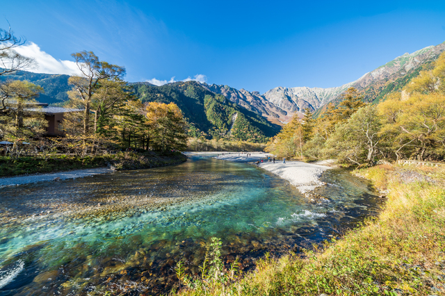 透き通った梓川の青い水、焼岳をはじめとする穂高連峰とのコントラストは、上高地ならではの絶景です。