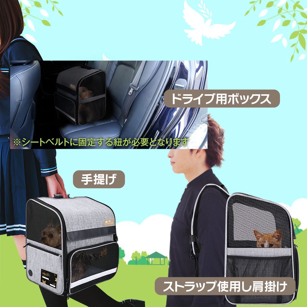 手提げ、肩掛け、ドライブ用の3way使えるペットキャリーリュックです