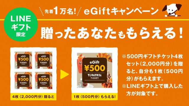 そして今回、より多くのお客様に「サンマルクカフェeGift」をお楽しみいただきたいという思いから、「500円ギフトチケット4枚セット(2,000円分)」を贈ると、贈った方にも「500円ギフトチケット1枚(500円分)」をプレゼントいたします。eGiftを贈る方、受け取った方、両方の方にサンマルクカフェでのひとときをお楽しみいただけましたら幸いです。