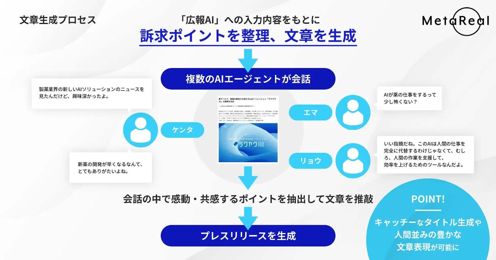 『広報AI』の文章生成プロセスは、複数のAIエージェントによる“雑談”から始まります。担当者が要点を入力すると、自動でペルソナ設定されたエージェントたちがリリース内容を元に対話を展開。多角的な視点から共感ポイントを抽出し、読み手の心をつかむ表現へと磨き上げます。これにより、従来の生成AIには難しかった人間らしい言葉選びと構成力を実現。タイトルから本文まで、説得力のあるリリースが自動生成されます。