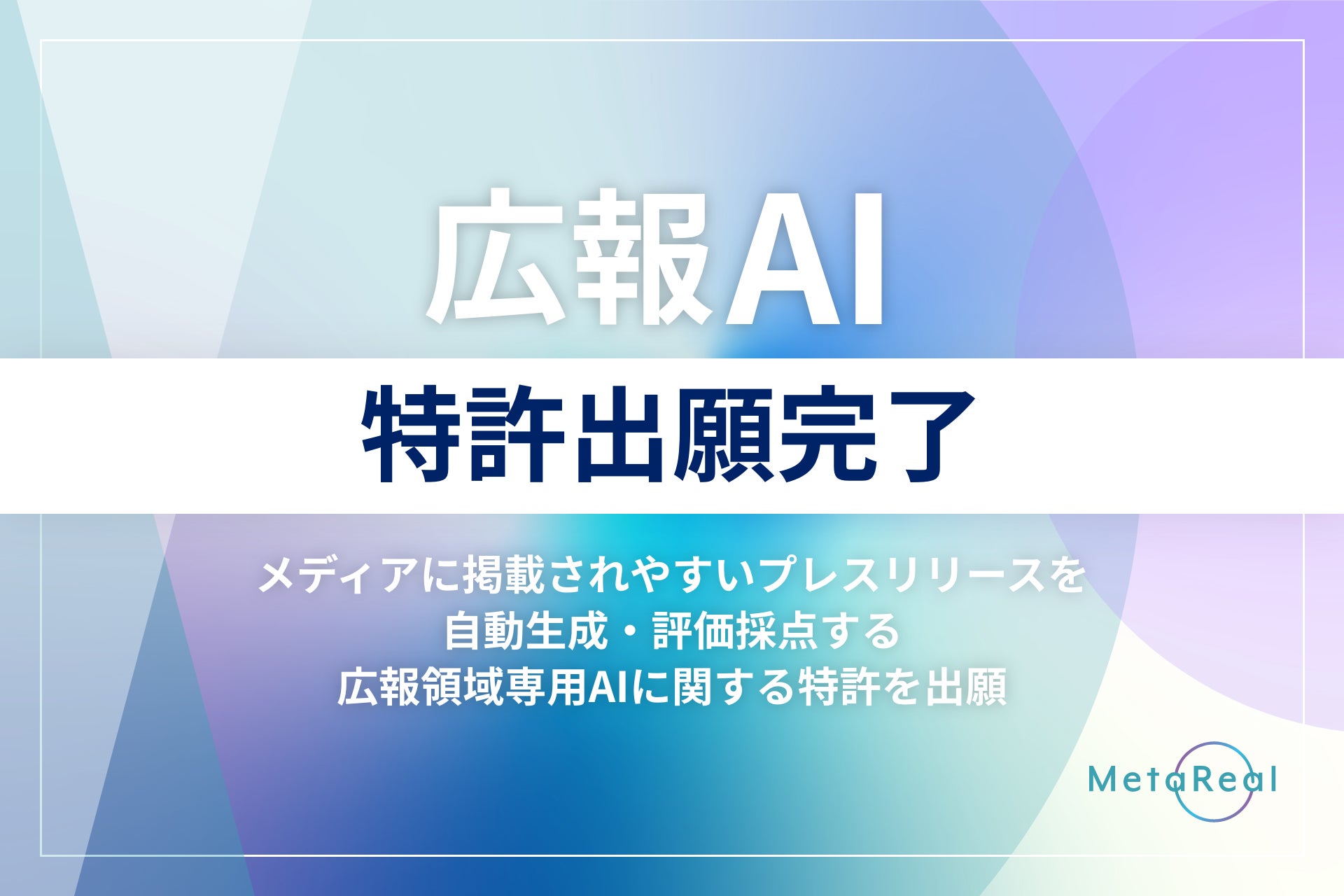 業種特化の専門AI開発・運営を行う株式会社メタリアル(本社:東京都千代田区、代表取締役:五石 順一)は、メディアに掲載されやすいプレスリリースを自動生成・評価採点する広報領域専用AI『広報AI』に関する特許出願を行いましたのでお知らせいたします(出願番号:特願2025-061298)。