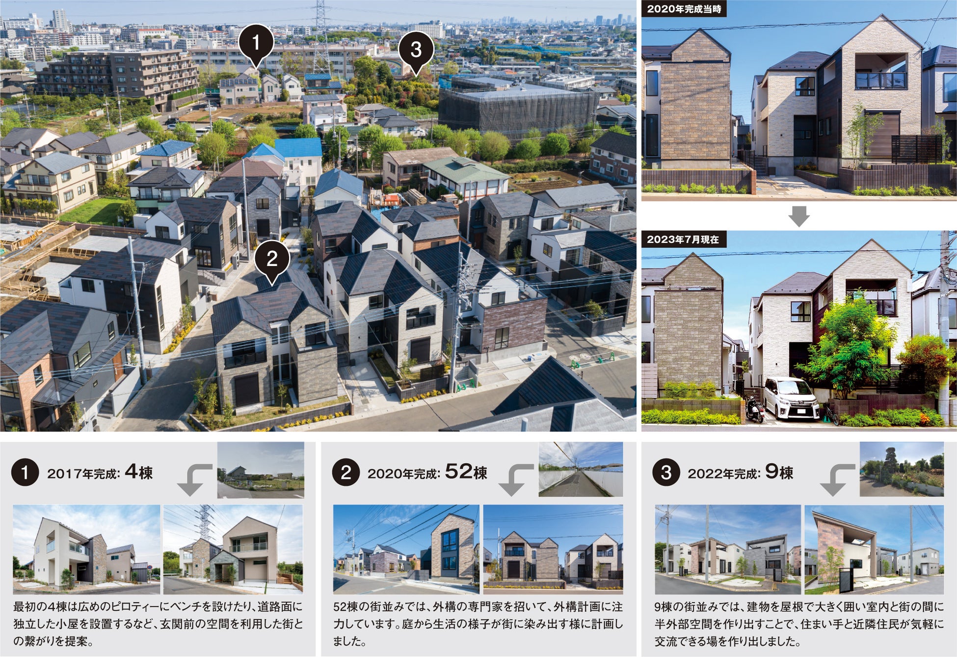 半径250m以内の範囲に5年の歳月をかけて造られた全65棟の戸建住宅群です。この地域は多くエリアを生産緑地で占めており、住宅は少ない場所でした。行政による最低敷地面積と外壁後退の条例もあり、優良な住宅街が求められ設計を行うにあたり、どのような街並みを想像することが住まい手と地域両方の未来に繋がる幸せな提案ができるか模索し、専門家のアドバイスもいただきながら緑豊かな環境を街区に引き込む計画としました。