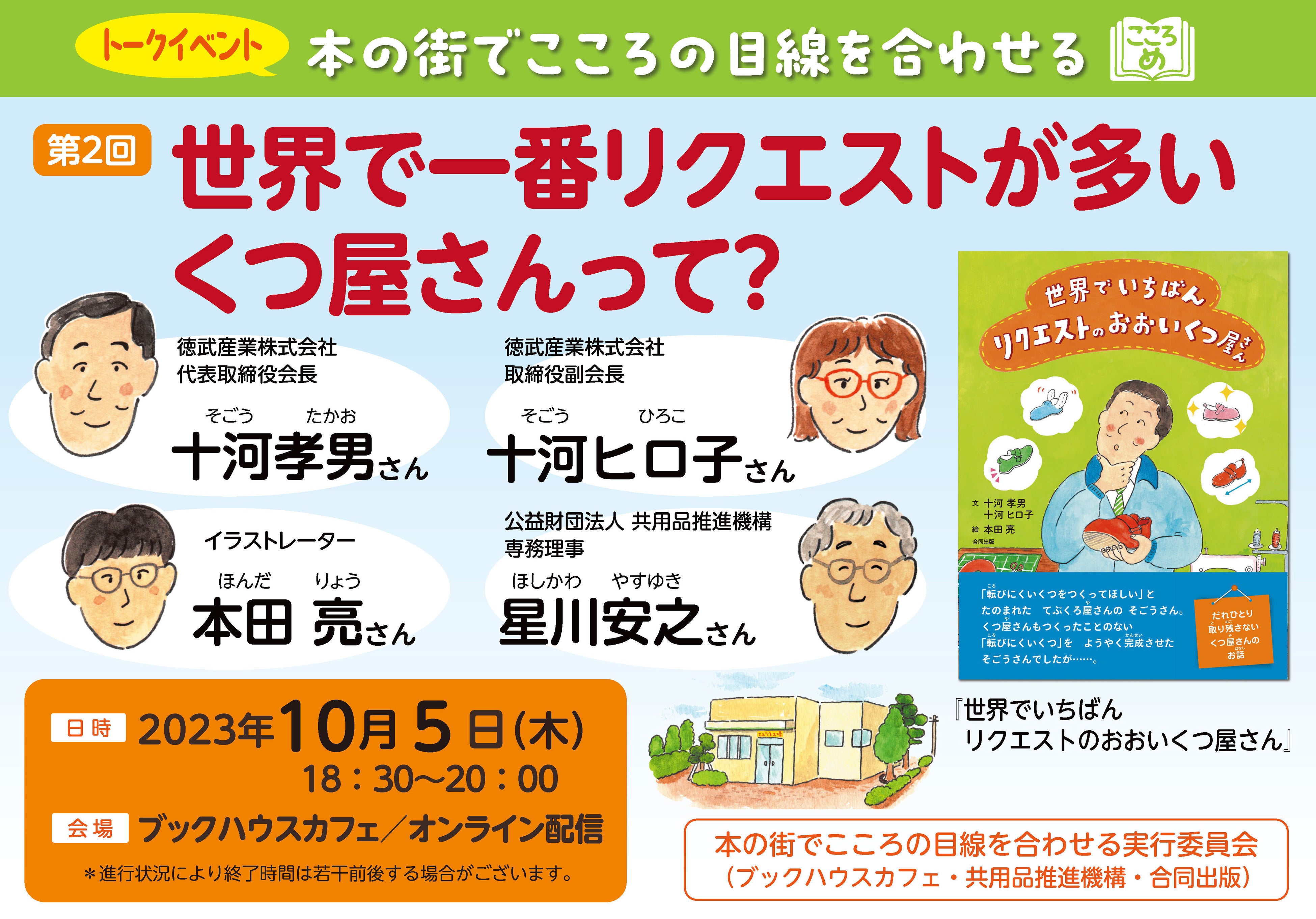 絵本に登場する「転びにくいくつ」を完成させた十河孝男さんと十河ヒロ子さん、本書の絵を担当した本田 亮さんにご登壇いただきます。そして進行役に公益財団法人 共用品推進機構の星川安之さんを迎え、「リクエストの多いくつのひみつ」についてお話いただきます。