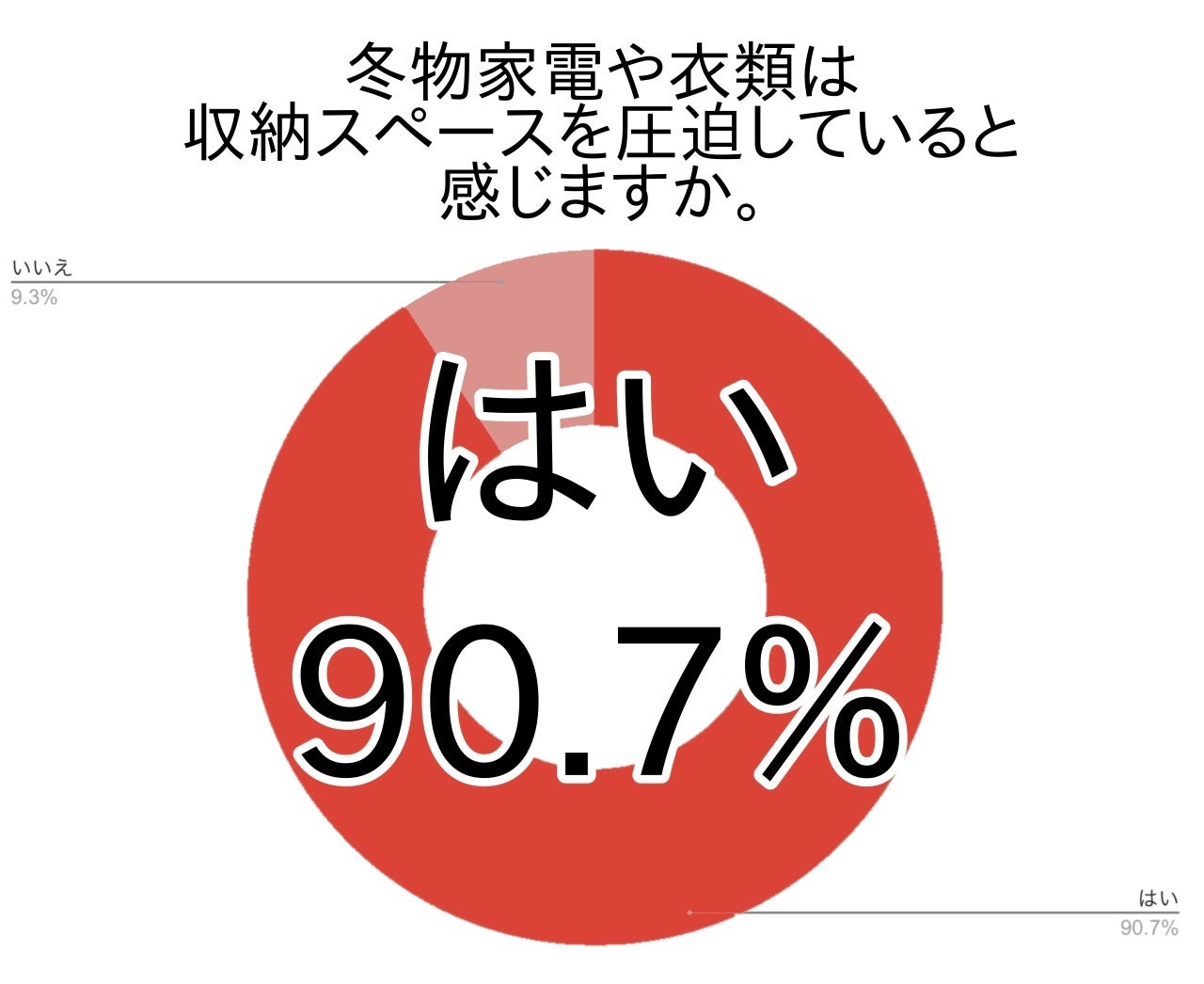 今回のアンケートでは、冬物家電や衣類は収納スペースを圧迫していると感じている方が関東で約9割(90.7%)・全国で約8割(84.0%)でした。