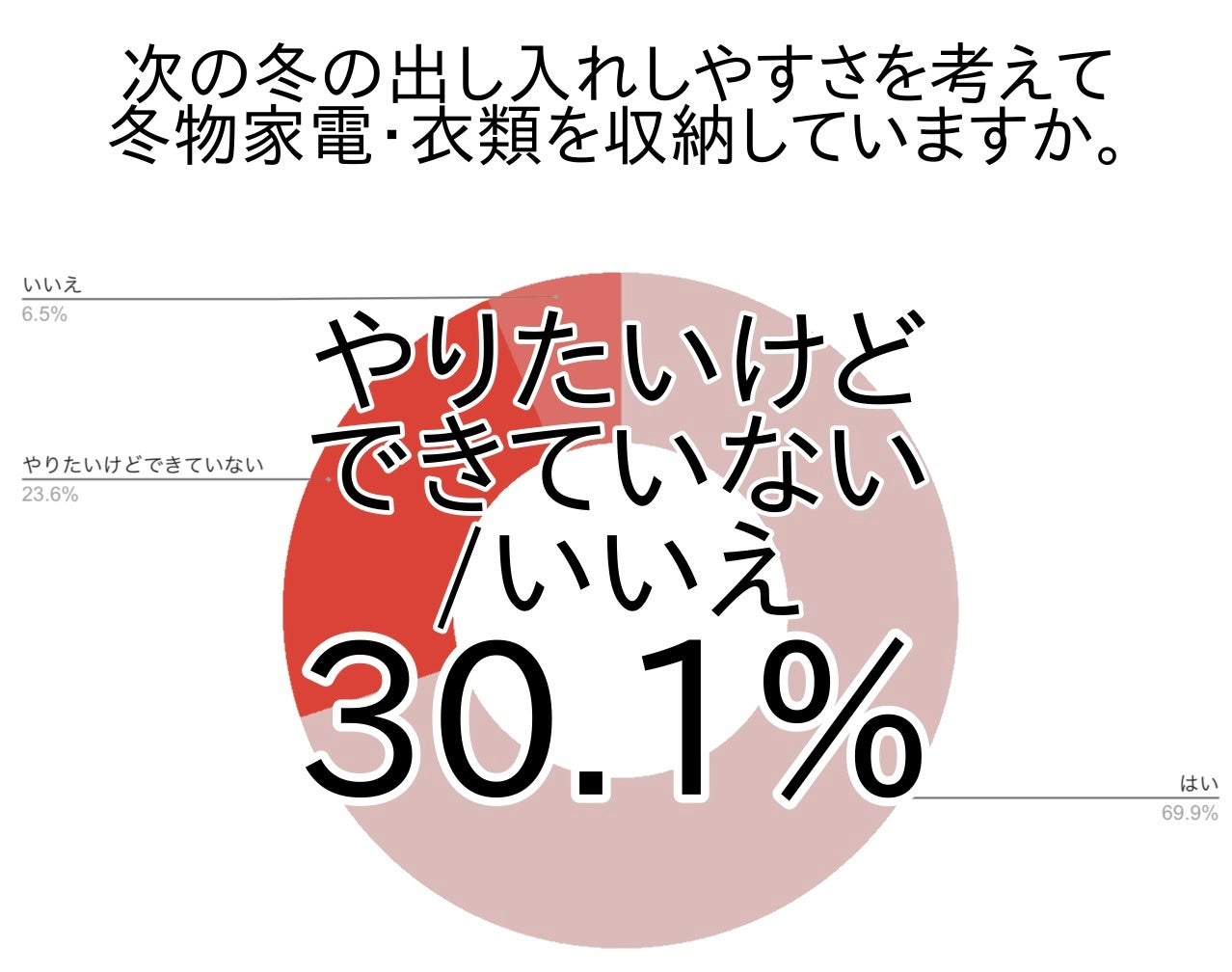 アンケートでは次の冬の出し入れしやすさを考えて冬物家電・衣類を収納できていない方が関東で約3割(30.1%)・全国で約4割(44.5%)でした(アンケート「やりたいけどできていない」「いいえ」の合計)。うち、やりたいと思っているけれどできていない方は関東で約2割(23.6%)・全国で約3割(32.0%)で、現実的にはなかなかそこまでできる時間的・スペース的な余裕がないという方が多いことがわかりました。