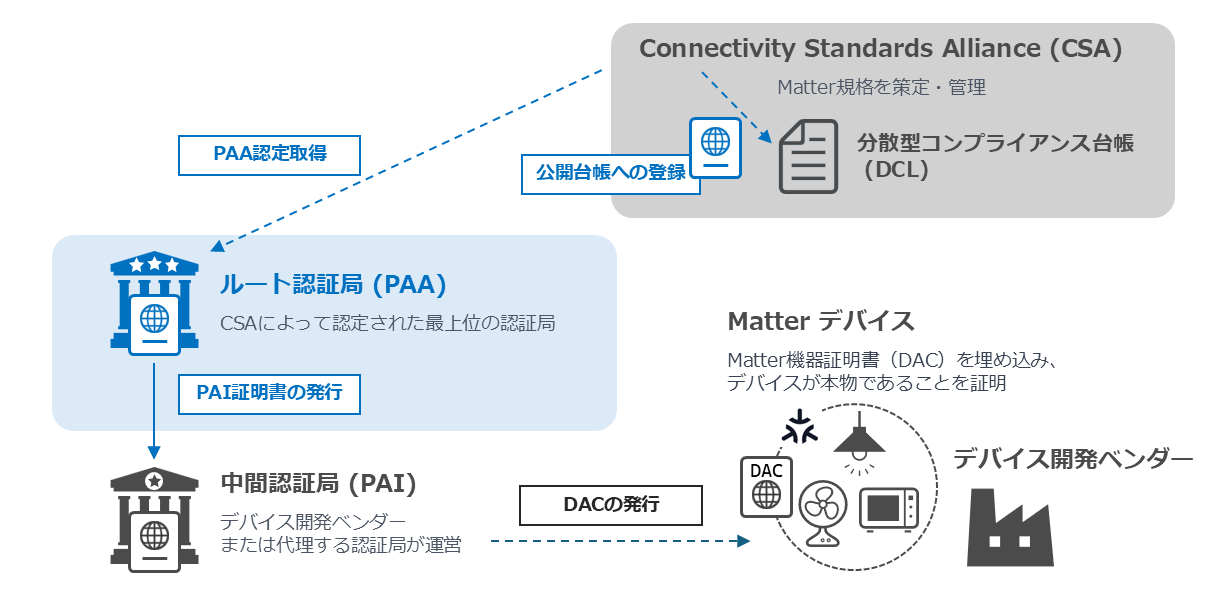 このたびの認定取得により、サイバートラストはMatterの標準化団体「Connectivity Standards Alliance(以下、CSA)」※3 のDistributed Compliance Ledger(DCL:分散型コンプライアンス台帳)に信頼された認証局として登録されました。開発ベンダーは自社でPAAを構築・運用することなく、サイバートラストが厳格に審査した真正なベンダーのみに向けて発行する証明書を利用可能になりました。