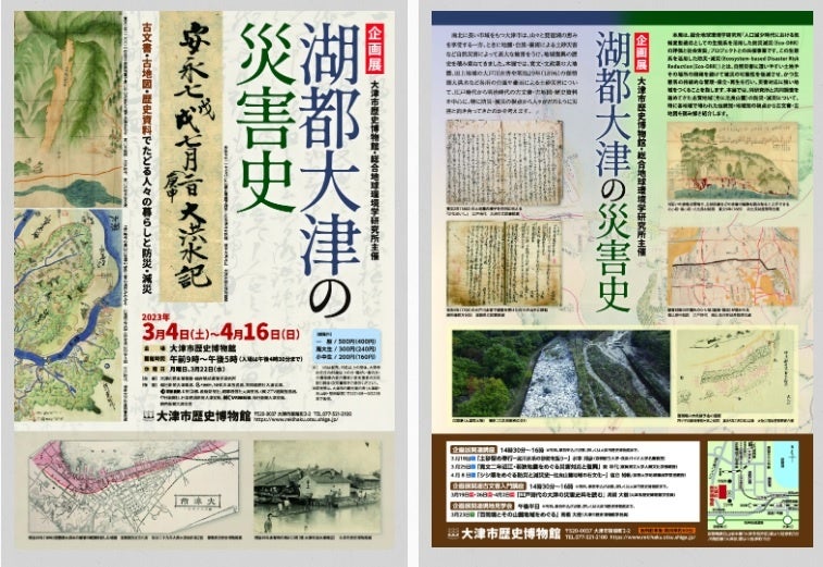 南北に長い市域をもつ大津市は、緑の山々と琵琶湖の恵みをうけるだけでなく、ときに地震・台風・土砂災害など自然災害による甚大な被害をうけました。 本展では、市域や湖西地域の災害史について、古文書や古地図を中心にその痕跡をたどります。また、近年注目されている生態系減災(Eco-DRR)の視点から、地域や人々による防災・減災の歴史について紹介します。ロビーで市内全学区のハザードマップを展示するなど、現在の防災・減災の取組みについてもあわせて紹介します。(大津市歴史博物館HP:https://www.rekihaku.otsu.shiga.jp/news/2209.html)
