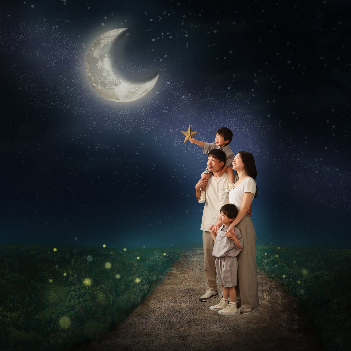家族はもちろんお子様一人やきょうだいで、三日月を見上げるようなポーズで撮影していただきます。その画像と絵本のような背景イラストを合わせて演出を加えたらできあがり。