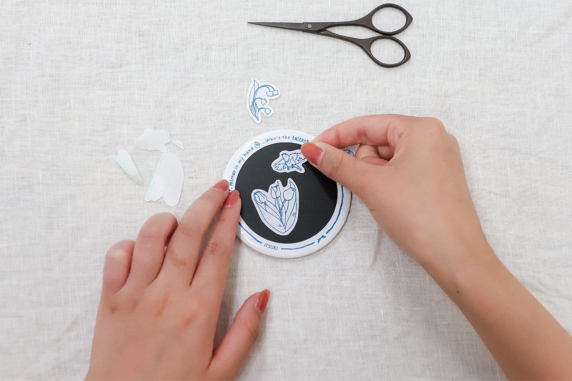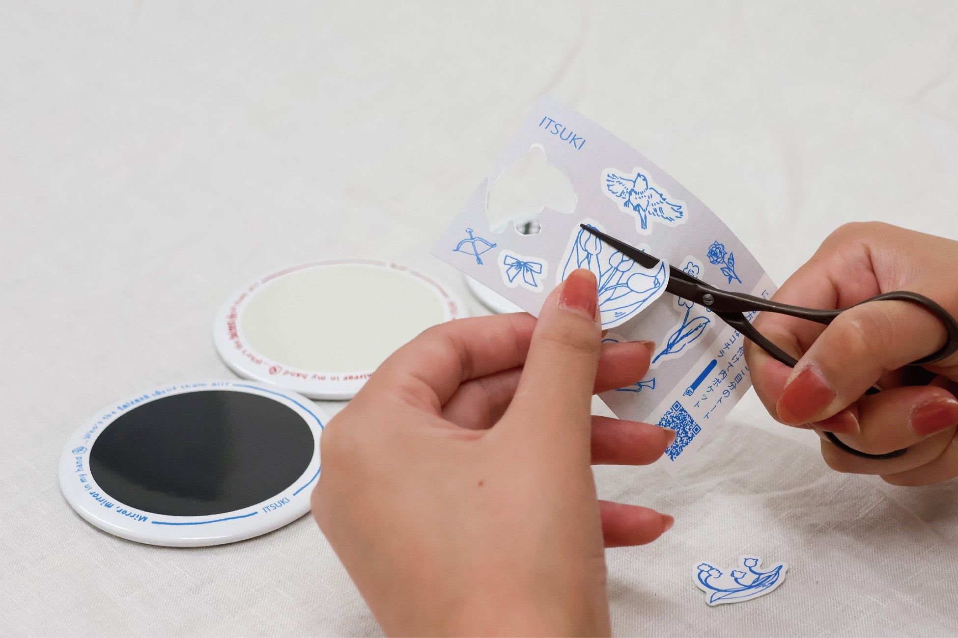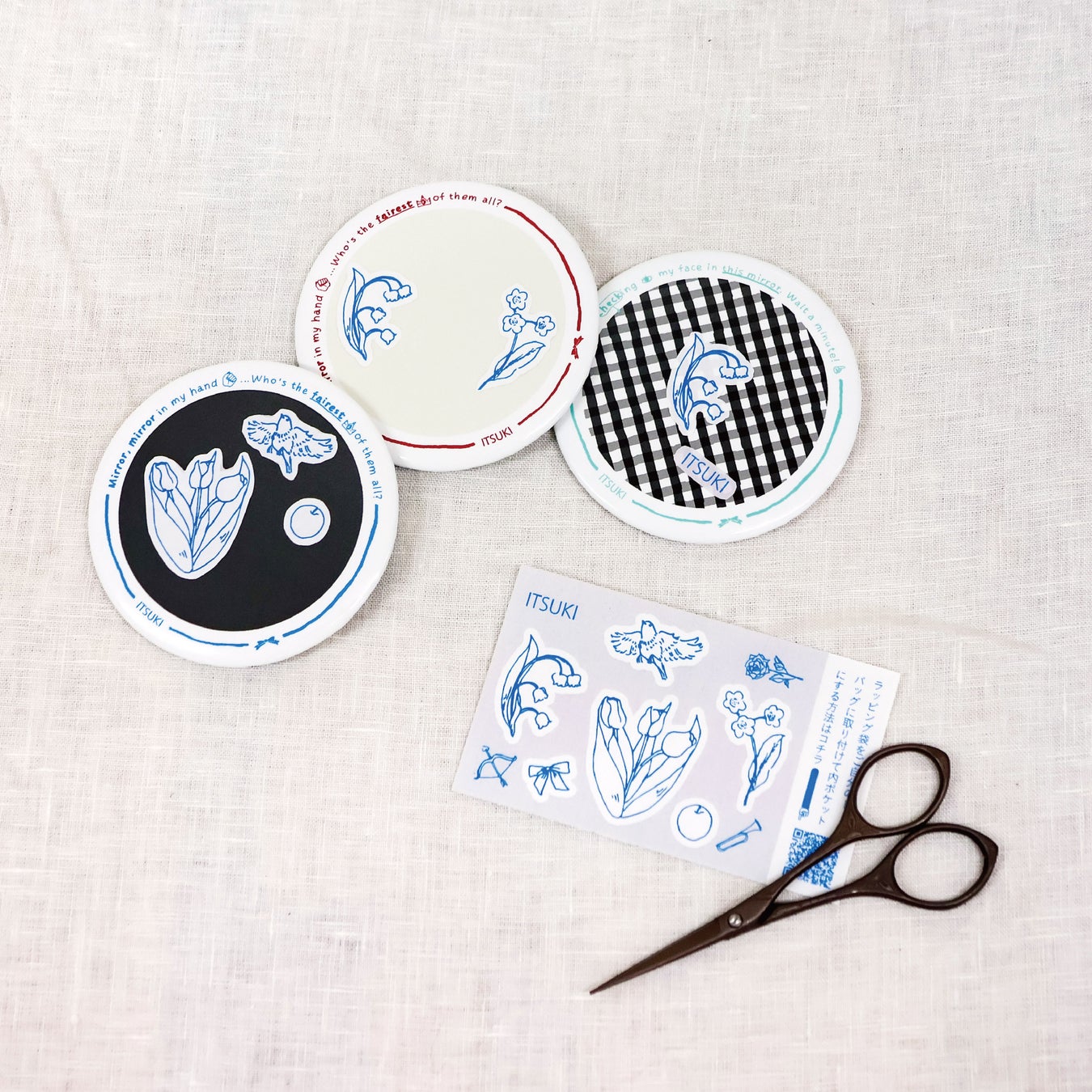ギフトバックの中にはギフトバックと同じ柄のコンパクトミラーと2wayギフトバックの使い方を見ることができるQRコードのついたカードを同封しています。 そのカードはシールになっているため、好きなイラストを切ってミラーに貼ることでオリジナルデザインのミラーにすることができます。お手持ちのお気に入りのシールを貼ってもらうのも〇