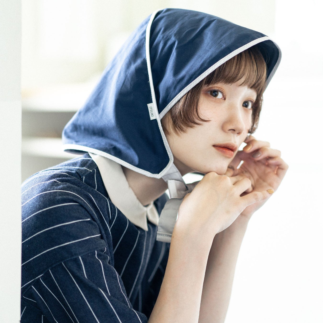 上から覆うようにかぶるデザインで寝ている間に髪がはねてしまうのをふせぐようにし、 顎の下でリボンを結ぶだけで装着できるようになっています。