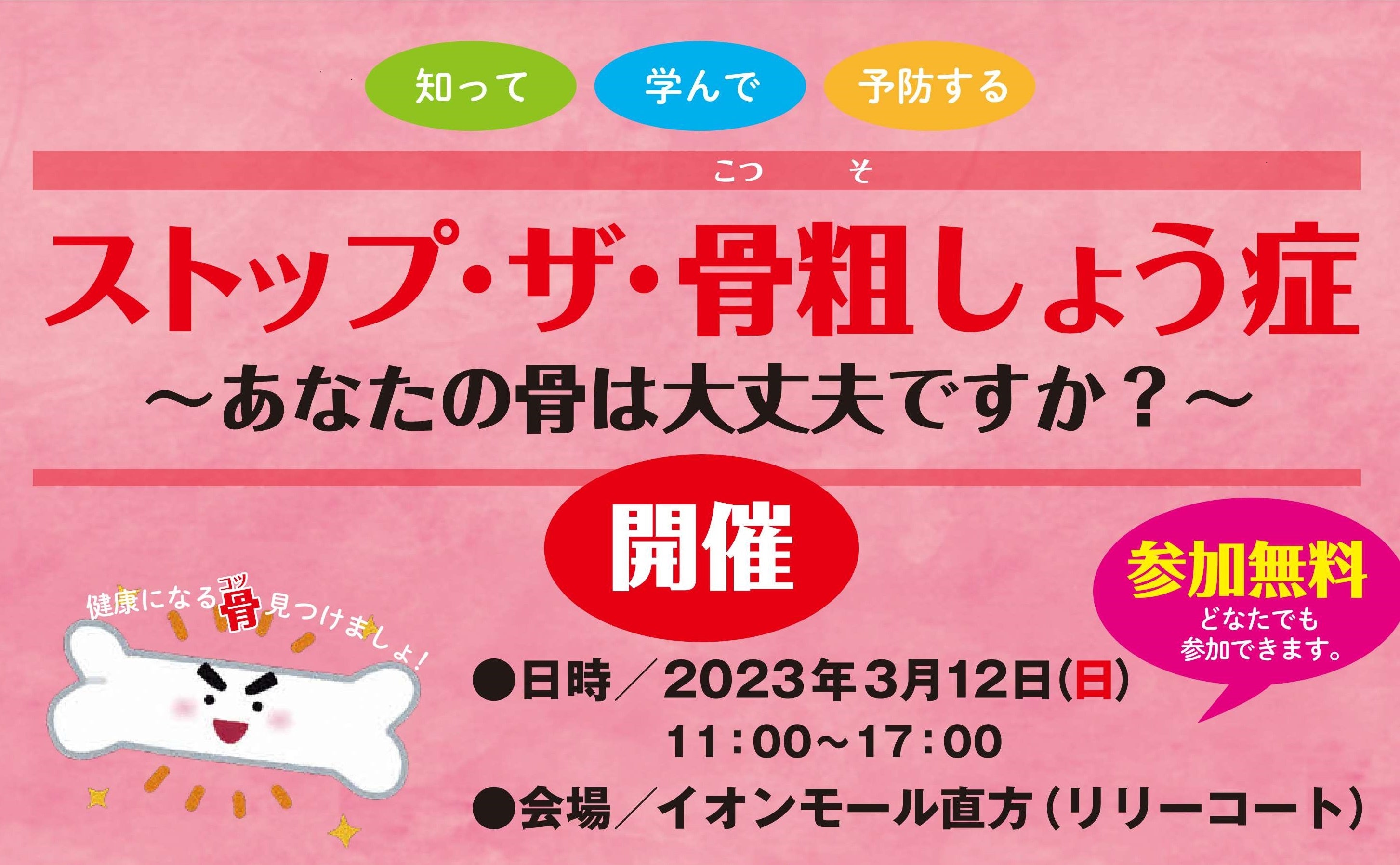 ストップ・ザ 骨粗しょう症 -あなたの骨は大丈夫ですか?-を3月12日にイオンモール直方(リリーコート)にて開催