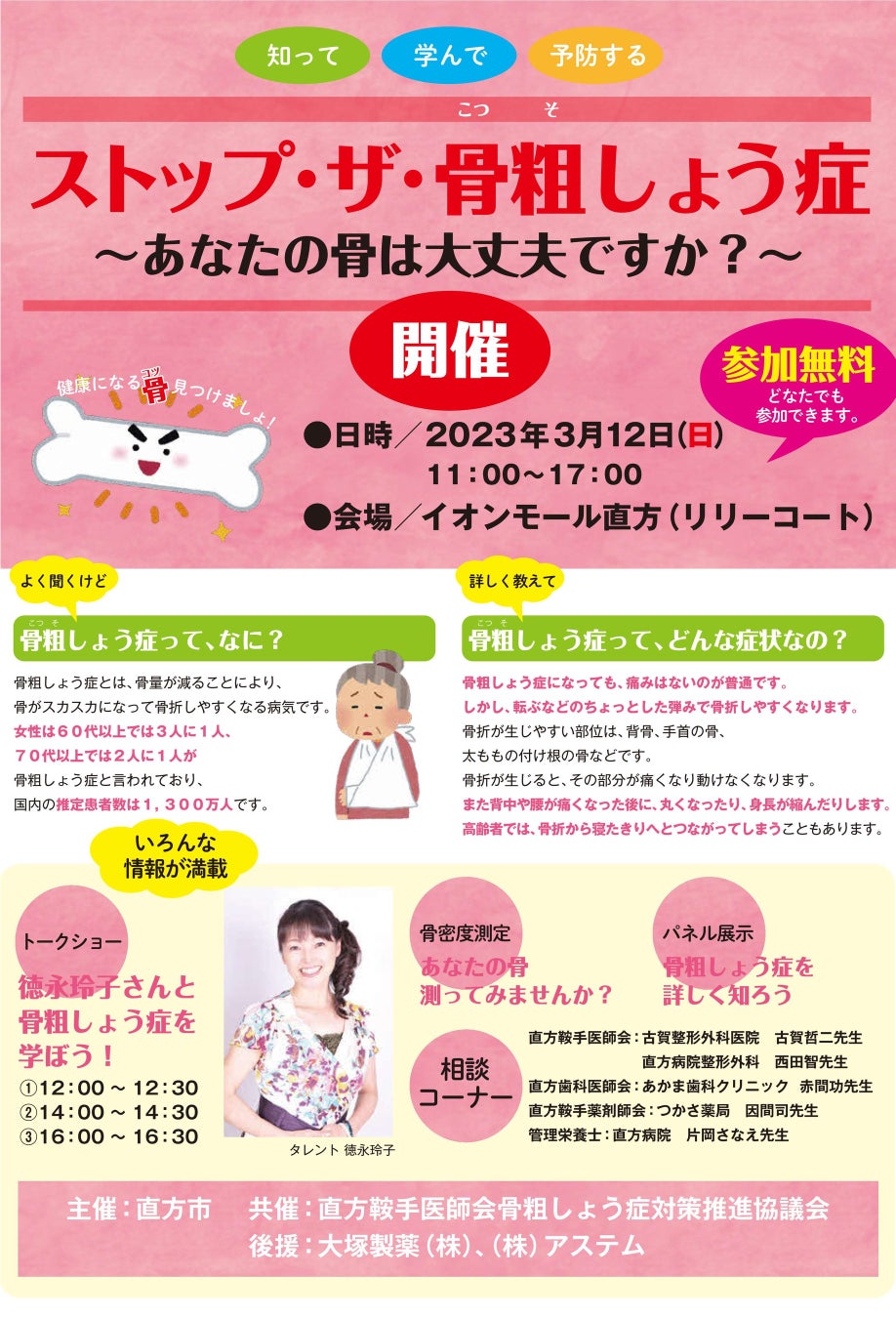 直方市は、骨粗しょう症に関する基礎知識、予防のための正しい知識の習得、検診の重要性を普及啓発するための参加型イベント「ストップ・ザ 骨粗しょう症 -あなたの骨は大丈夫ですか?-」を令和5年3月12日(日)に開催致します。