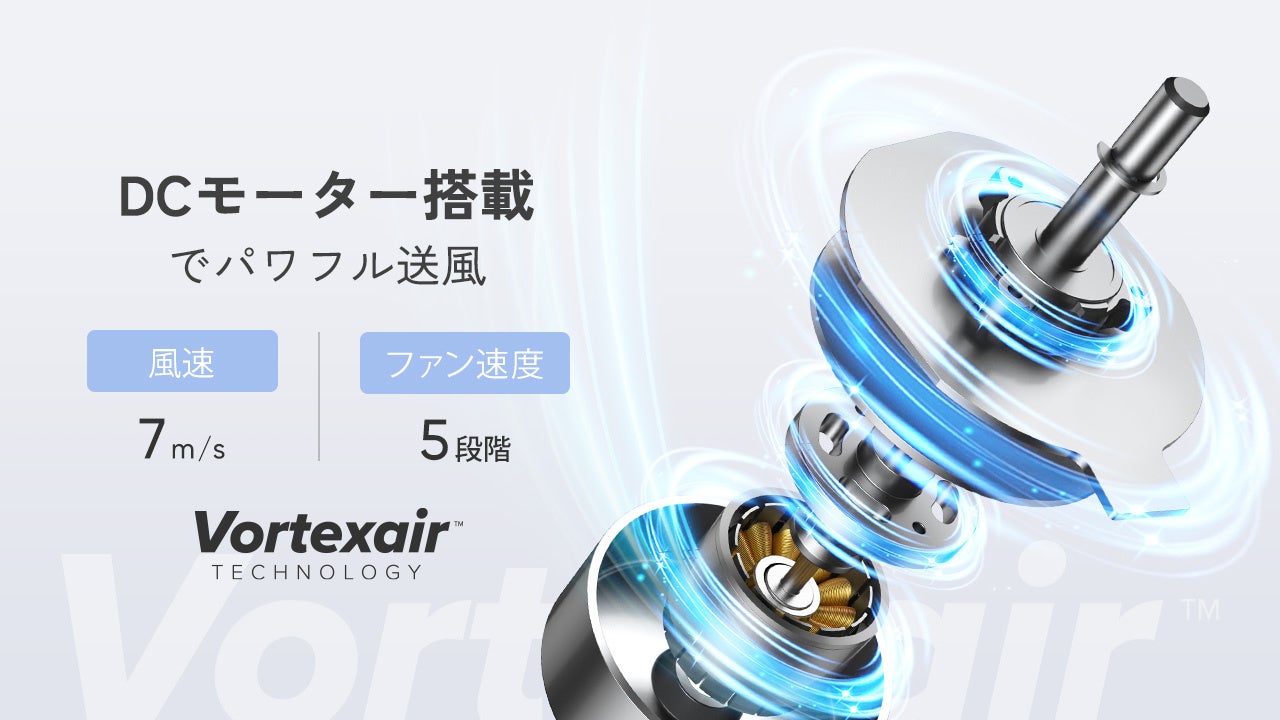小型ながら高性能DCモーターを搭載し、最大風速約7.0m/sを実現。しっかりとした風量で、蒸し暑い季節の不快感を軽減します。また、独自の特許技術 「Vortexair(ヴォーテックスエアー)テクノロジー」 により、空気の流れを効率的にコントロールし、自然に近いやさしい風を届けます。