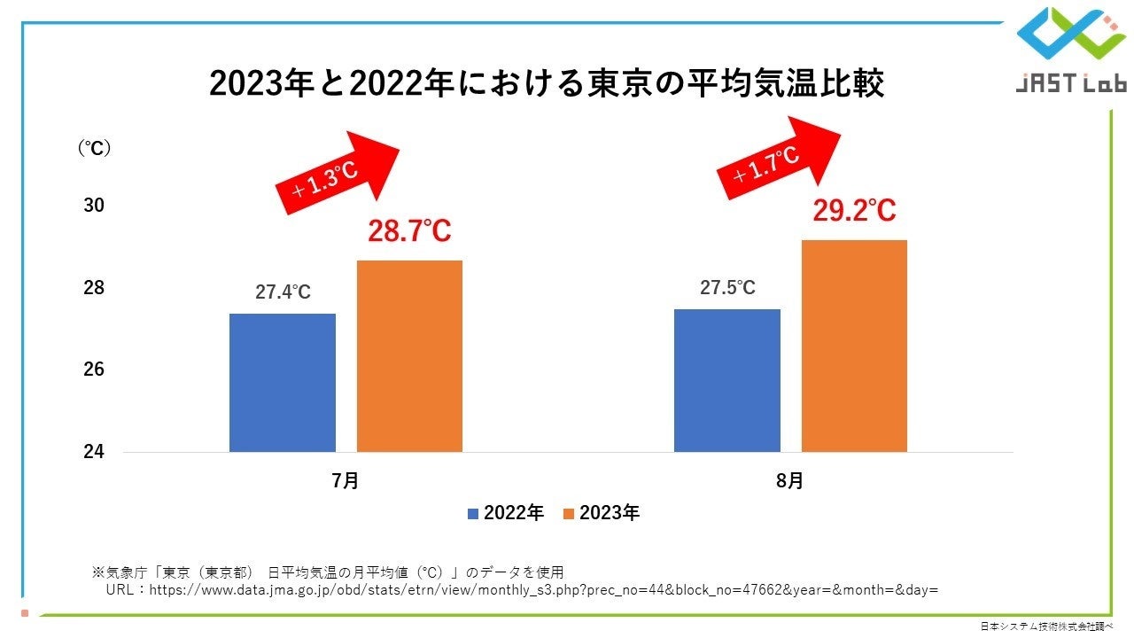 このような増加傾向は、気候変動や都市化の進行により、気温が上昇していることが一因と考えられます。以下は2023年と2022年における東京の平均気温を表したものです。